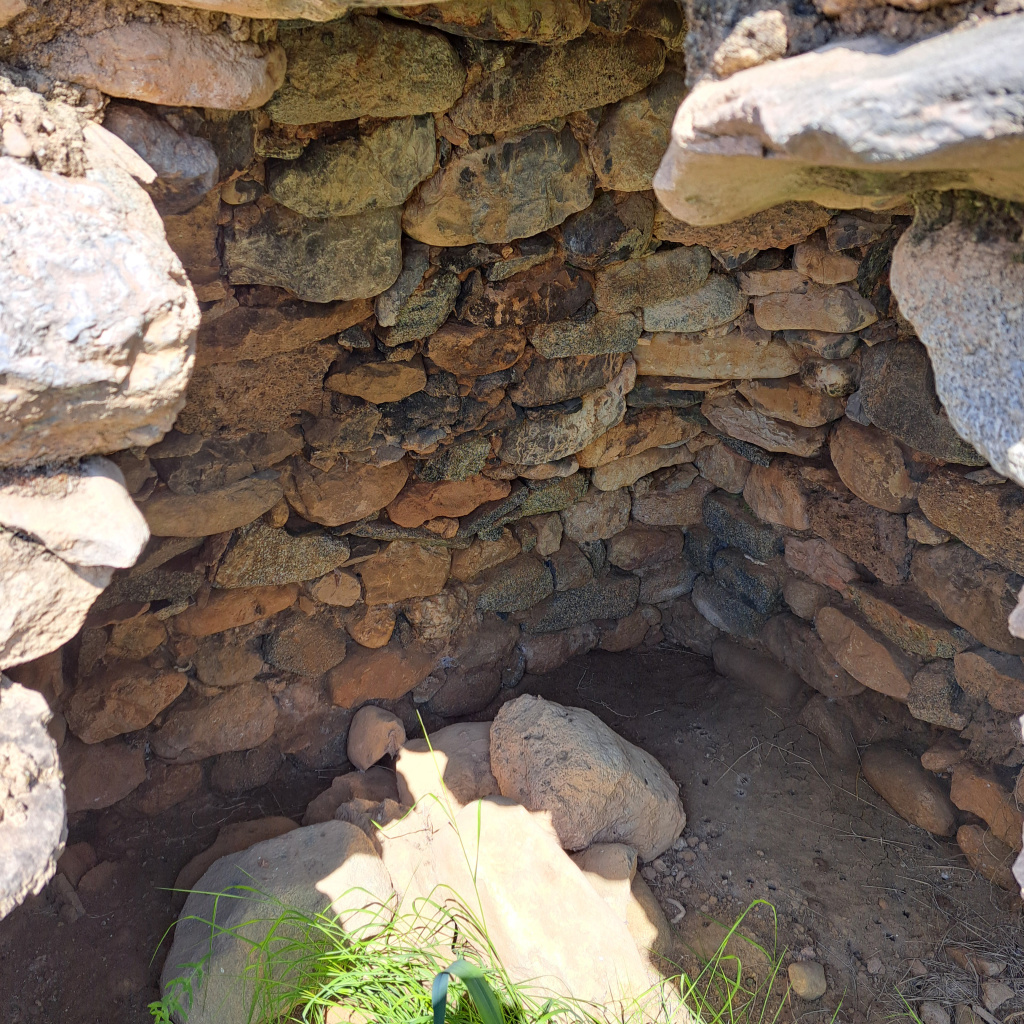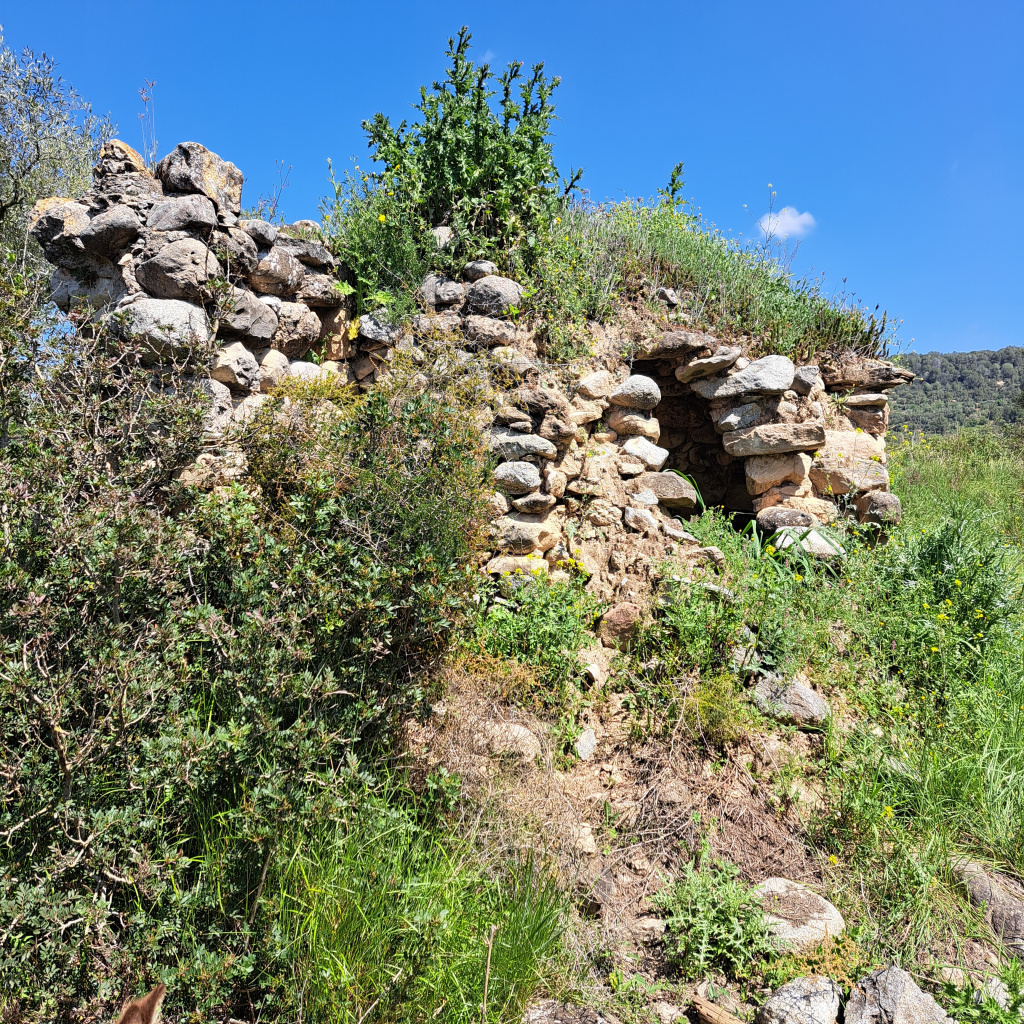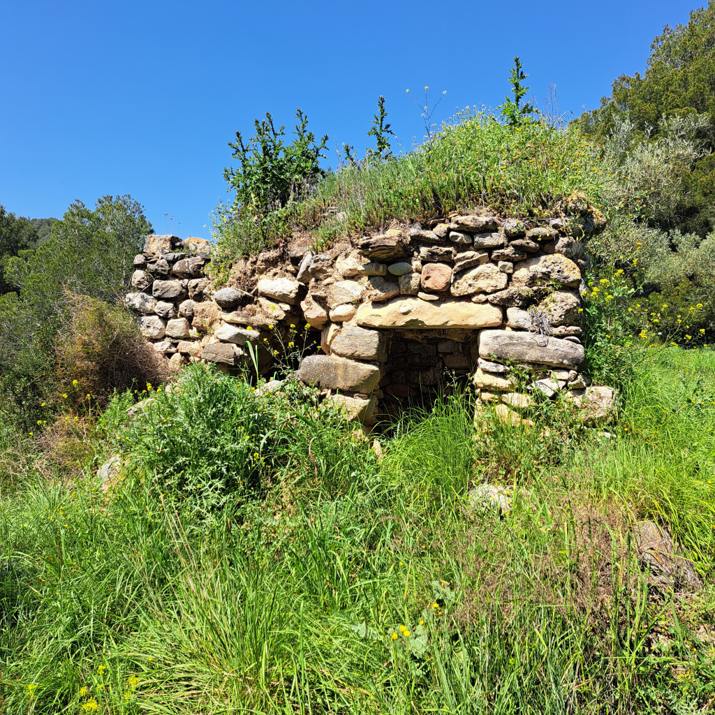 És una construcció aïllada, construïda aprofitant una estructura anterior de la qual en queden dos murs que formen cantonada. Són fets de còdols lligats amb morter. A la part de migdia s'hi va construir una barraca amb la tècnica de la la pedra seca. La tipologia constructiva és de falsa volta troncocònica, coberta exteriorment amb terra i pedruscall. La porta s'orienta a migdia i és amb llinda de pedra. A la part lateral té una esllavissada que ha obert un forat.