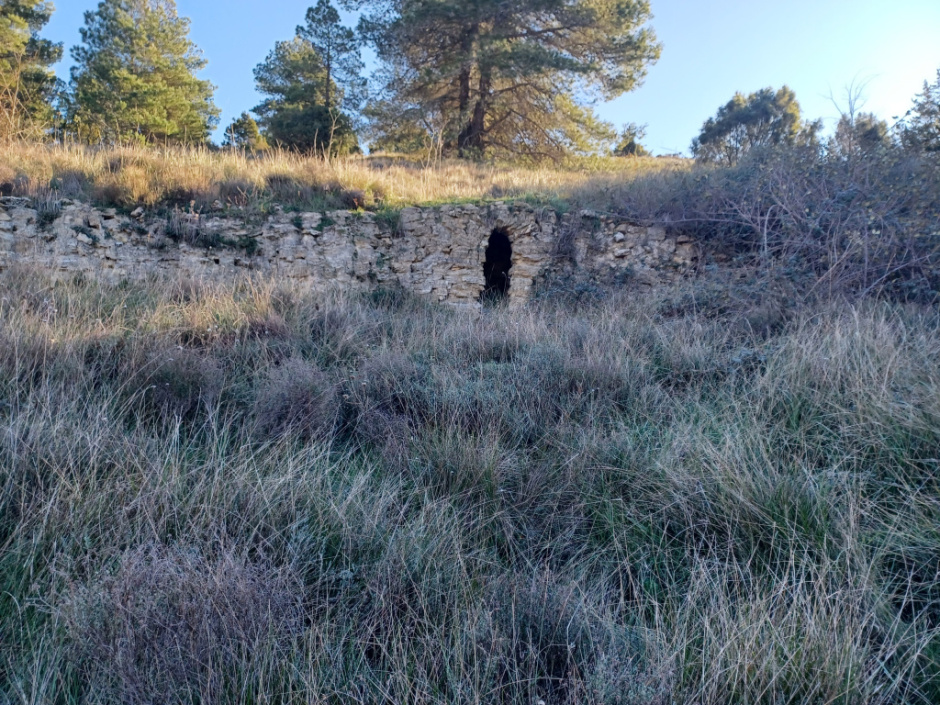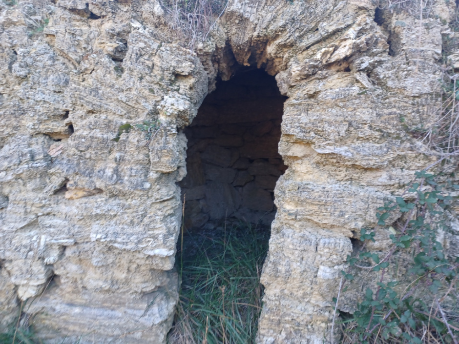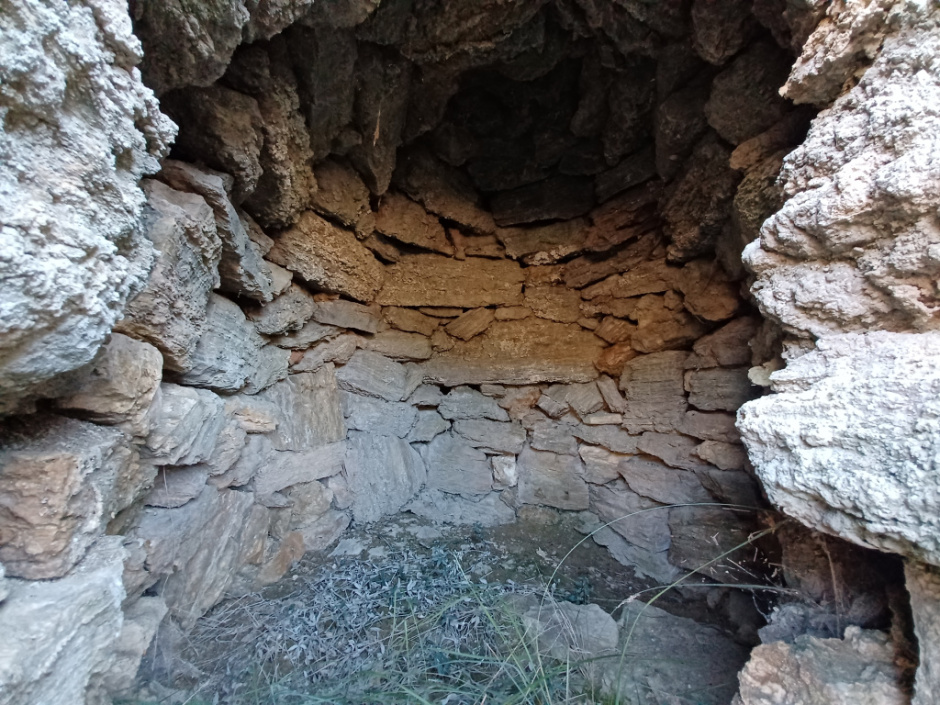 Barraca integrada en un antic mur d’aterrassament de pedra seca.
