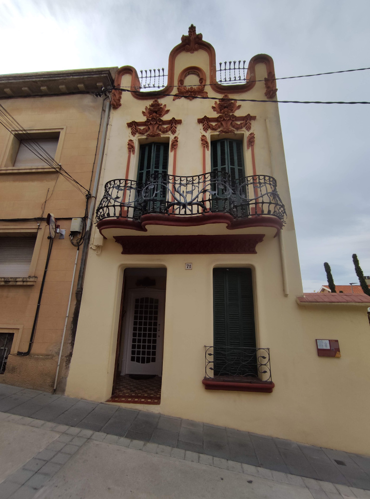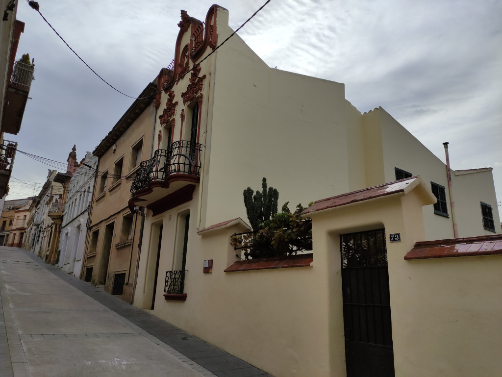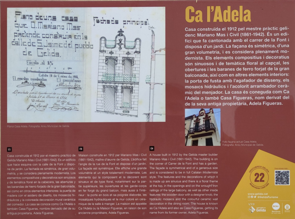 La façana real és lleugerament diferent del projecte previst, tal com es pot veure a la placa interpretativa del recorregut de la ruta municipal de la Gelida Modernista.