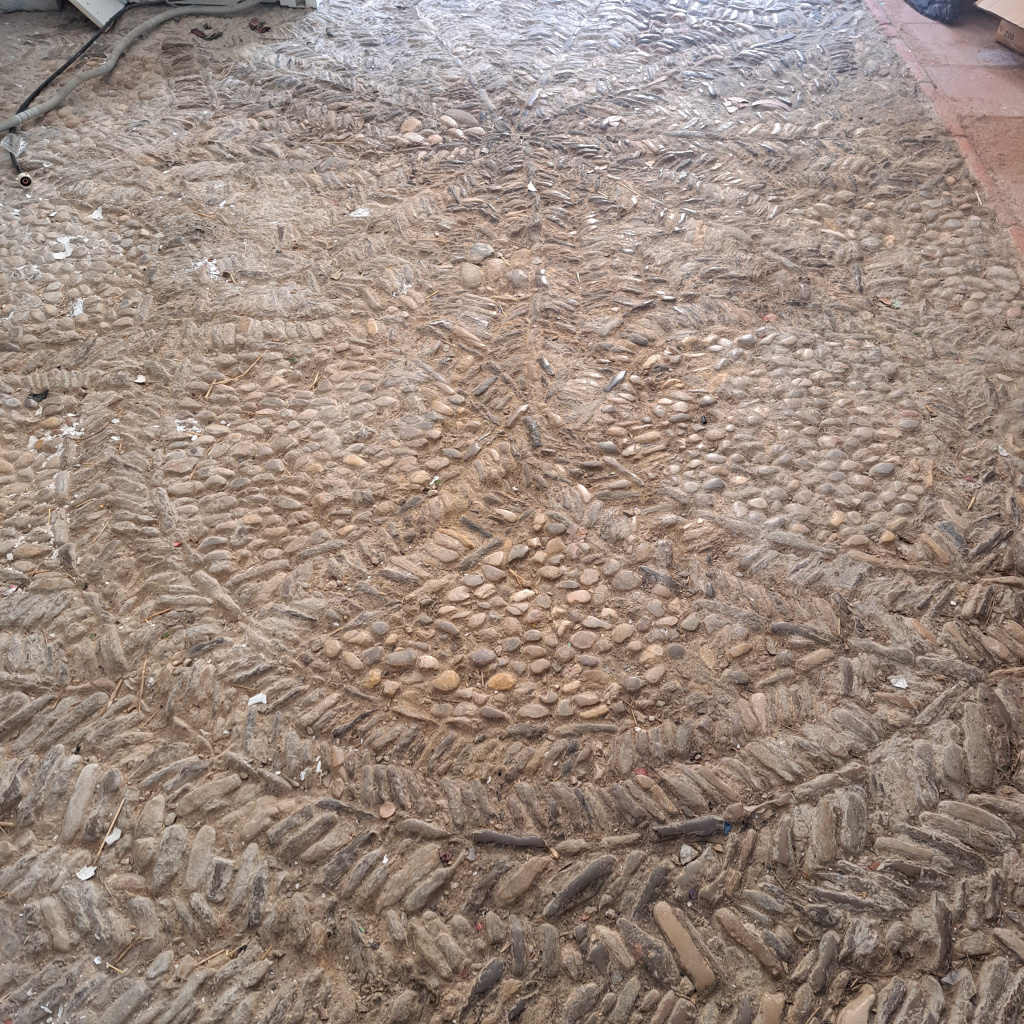 El ràfec està acabat amb una cornisa. El tractament exterior del mur és arrebossat i pintat, a la planta baixa amb els carreus de les cantonades vists. A l'entrada s'hi conserva un destacat paviment de mosaic de còdols amb una estrella i un cercle al centre.