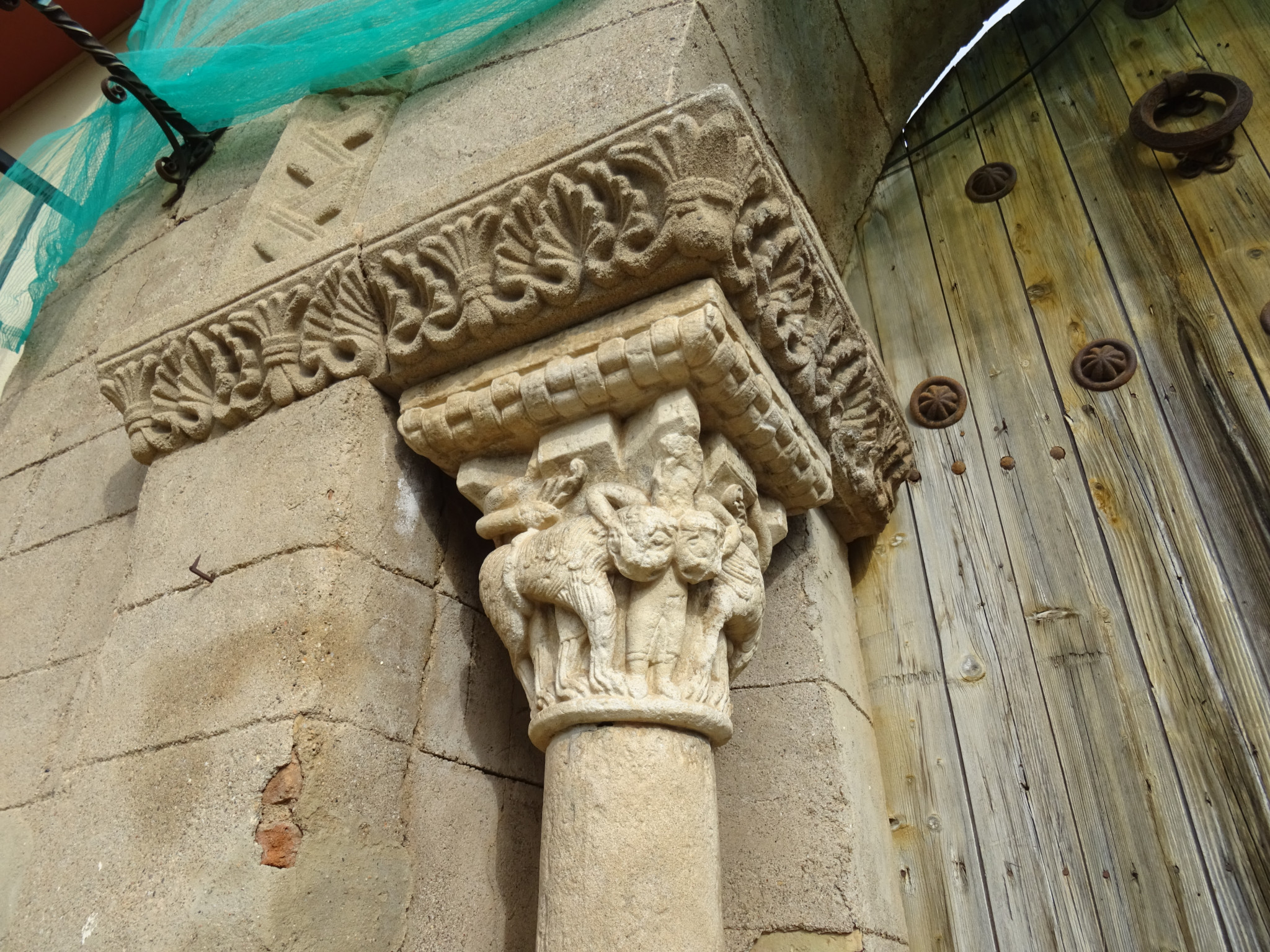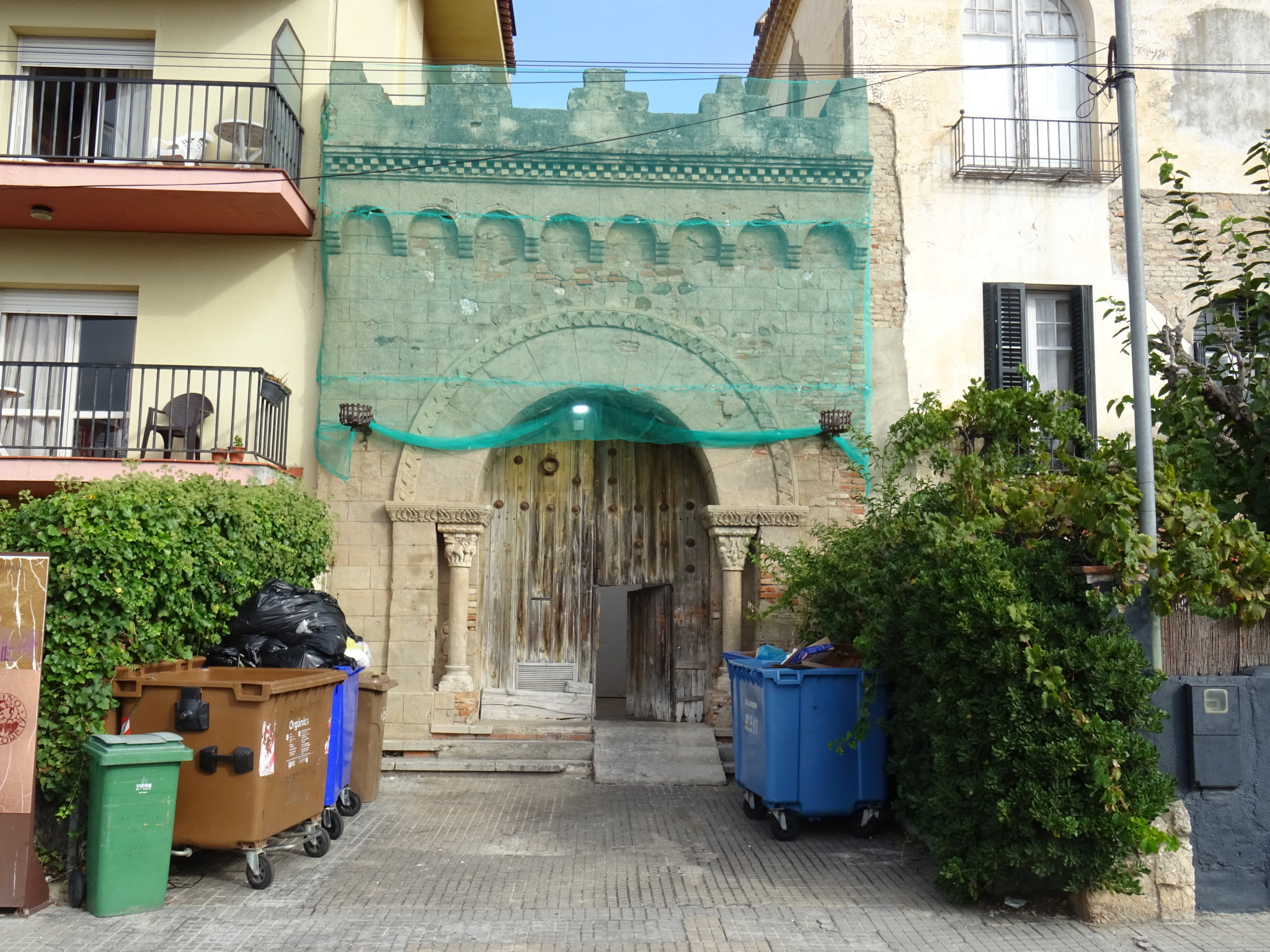 A l'esquerra de l'edifici hi ha un muret que conté una portalada neoromànica. Consta d'un arc de mig punt adovellat que descansa sobre impostes decorades, sota les quals hi ha dues columnes amb capitells esculpits. Aquesta obra és feta amb maó arrebossat i també amb pedra.