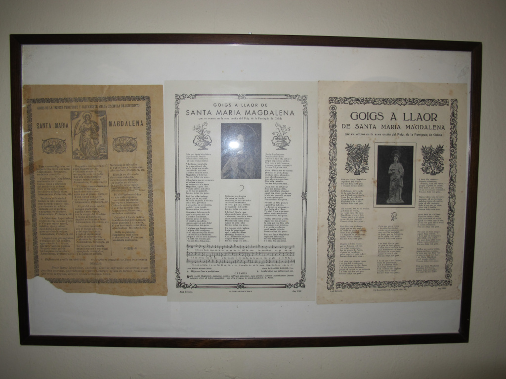 Finalment, esmentar les donacions a la capella segons les notes de Carafí recollides a l'article del Programa de Festa Major de l'any 2018 les peces incorporades per vestir la capella són un parell de setials donats per E. Carafí, un tapís que representa santa Rita donat pel matrimoni Rosell-Cusó, i un que representa sant Francesc d'Assís i Jesús a la creu (1922) pintat Rosa M. Llopart i Mir donat per la família Almirall de Can Duran. A l'interior també hi ha una còpia del poeta gelidenc Jaume Vila, "Santa Magdalena" que glossa la capella, i una mostra de tres goigs diferents de la Santa. També una làmpada donada per Antoni Carafí.