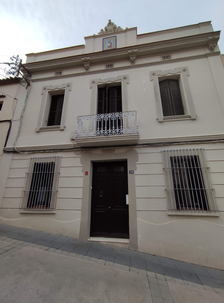 La façana principal, orientada al carrer Jaume Via, és simètrica amb un portal central flanquejat per dues grans finestres rectangulars amb reixa de forja. Al pis hi trobem un balcó central amb barana de forja flanquejat per dues finestres rectangulars. La testera arrenca amb una gran cornisa amb quatre mènsules i tres respiralls intercalats. Sobre la cornisa, al centre hi trobem un plafó ceràmic que mostra un sagrat cor, que està coronat per una decoració de motius vegetals.