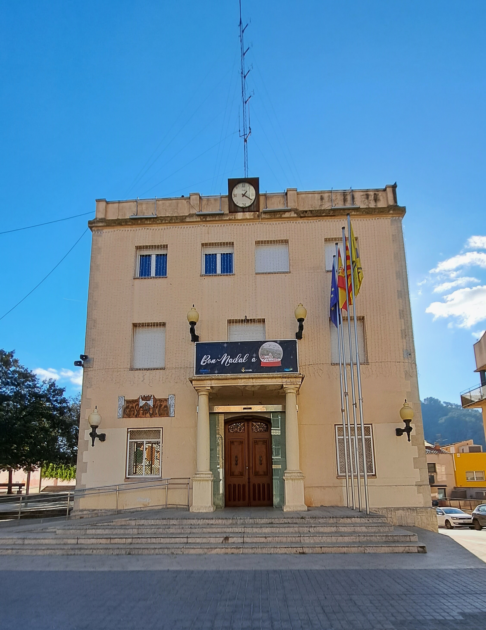 Coronant l’edifici, destaca un rellotge contemporani i a esquerra, a sobre d’una de les finestres de planta baixa que flanquegen el portal d’accés, hi ha un plafó ceràmic, amb la inscripció "Casa de la Vila" i l'escut del municipi.