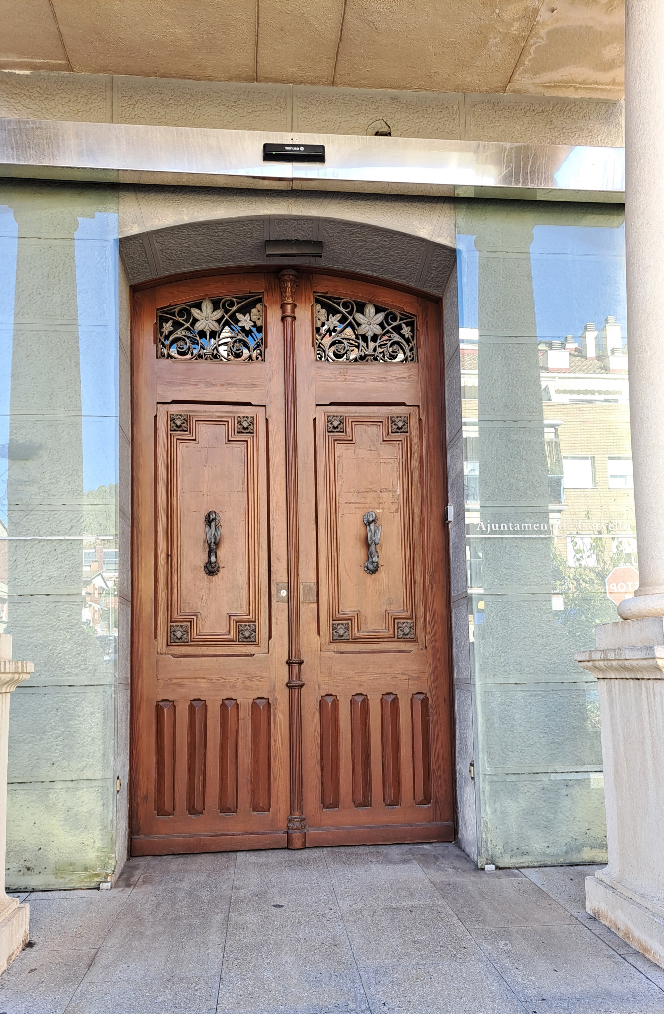 La peanya del balcó principal descansa sobre un arquitrau sostingut per sengles columnes de fust llis i base quadrada. Quatre fanals de vidre il·luminen la façana a l’exterior. Entre les columnes s’obre la porta principal que dona accés a l’edificació, la qual conserva la fusteria primitiva, tallada, presentant a la part superior, vidre protegit per l’enreixat original, de ferro forjat, amb decoració vegetal mig daurada. També es conserven els picadors de ferro.