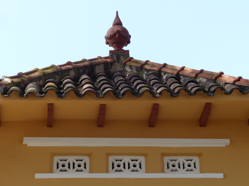 El parament és imitant carreus pintats de color terrós ocre, amb recreixement a les cantoneres amb una franja vertical dentada de carreus buixardats i pintats de blanc. Complementa el programa ornamental els resseguiments de els obertures, també pintats de blanc, que destaca del fons ocre.