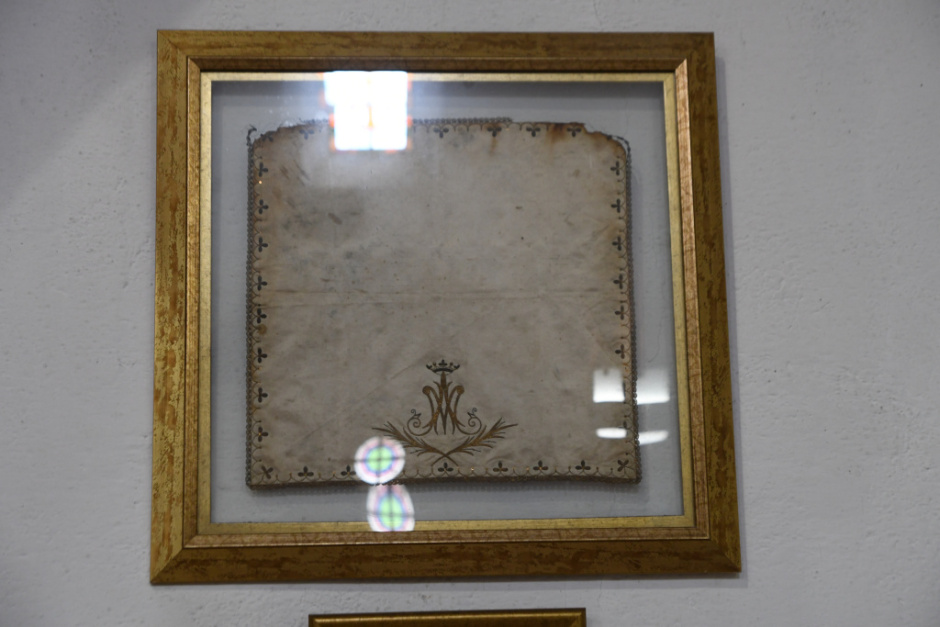 Aquest cobrecalzes es va salvar de la crema gràcies a la intervenció d'un veí, Jaume Coll i Prat, de Can Garret. La crònica (Rifà; 2019, pp. 84) ho relata com un acte d'heroisme ja que explica que entrà amb l'església en flames i el sostre s'ensorrà poc després de sortir-ne ell amb el cobrecalzes.
