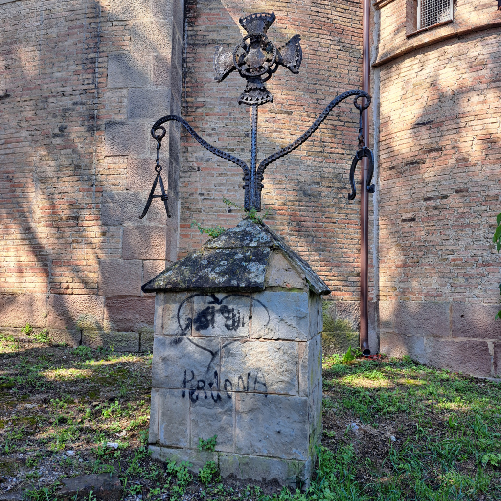 És una creu patent feta de forja profusament treballada. De la tija de la creu en surten dos braços dels quals pengen una lletra alfa i una omega, tot de forja. La base és quadrangular amb acabament piramidal, revestida de lloses.