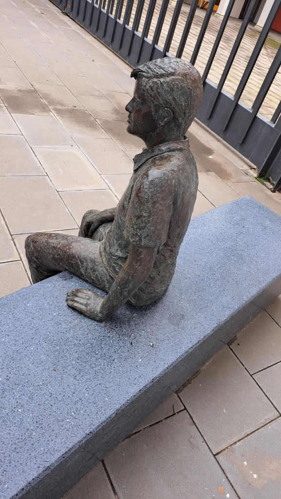 Escultura de bronze que representa un jove assegut en un banc de pedra, amb una postura relaxada i natural, que sembla convidar l'espectador a connectar-se amb ell d'una manera íntima i adequada.