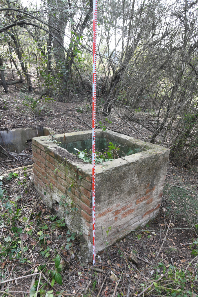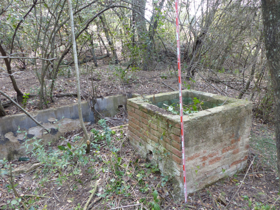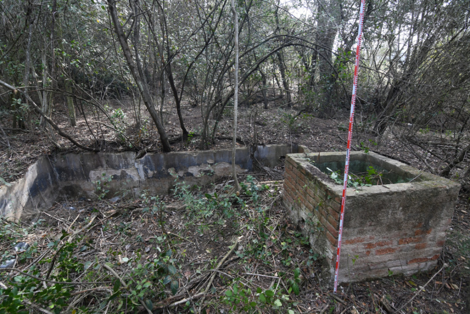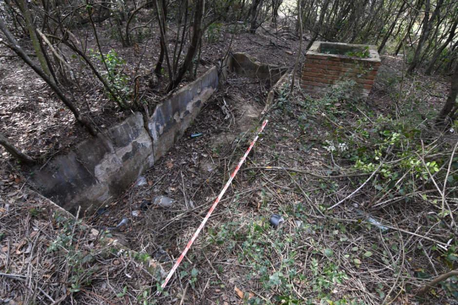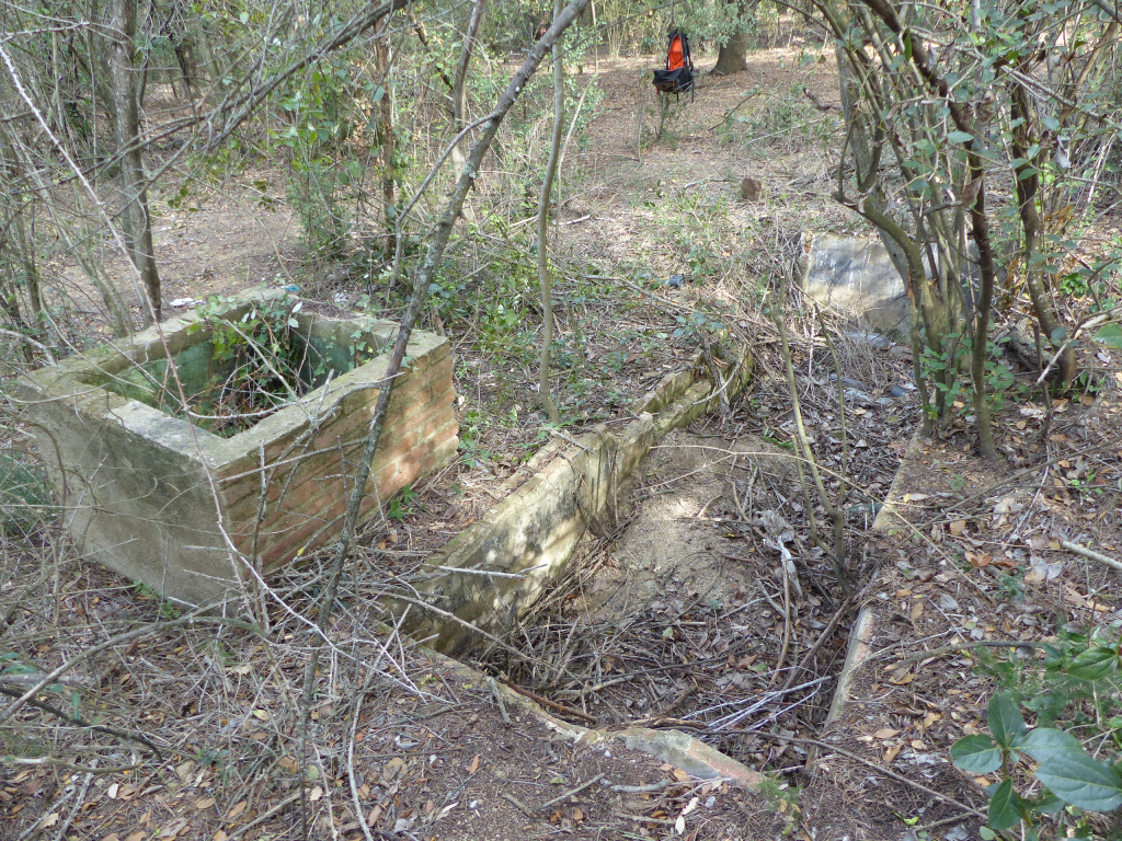 Entre la vegetació s'observa una canal de pedra de recollida d'aigües pluvials gairebé colgada per la terra que omplia la cisterna.