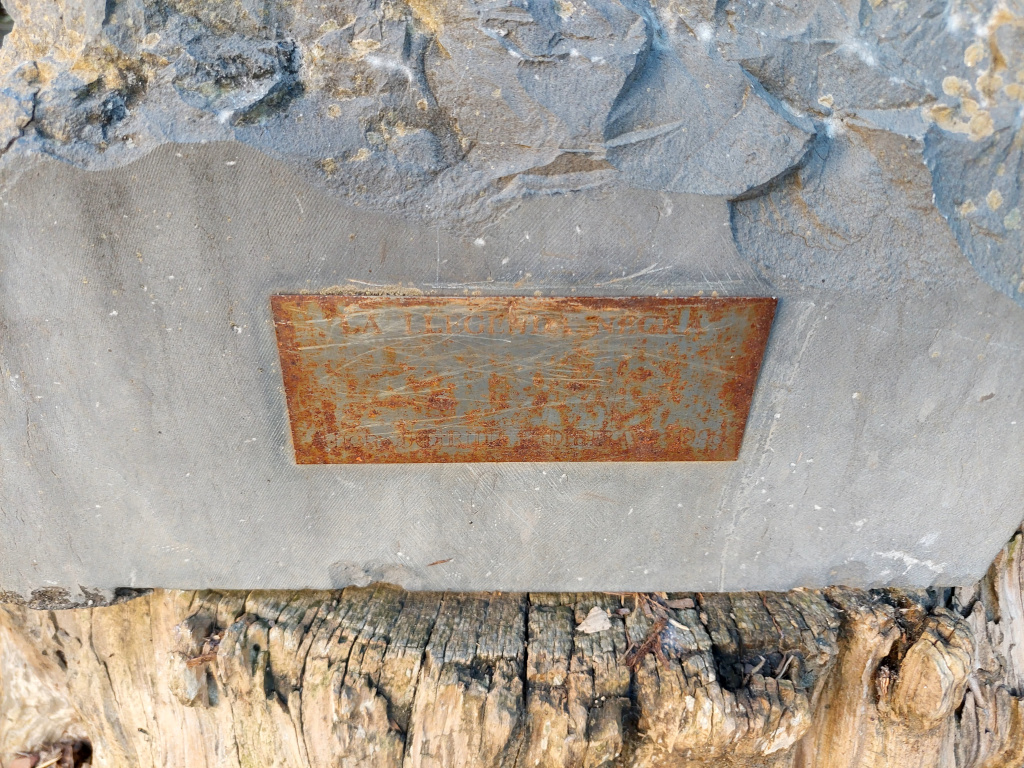 Té unes dimensions d'1,50 m d’alçada, 0,65 m d’amplada i 0,60 m de fondària, i està disposada sobre la soca d’un arbre. A la part frontal de la base porta una placa de metall pràcticament il·legible amb la inscripció "LA LLEGENDA NEGRA AUTOR JORDI TORRAS 1996".