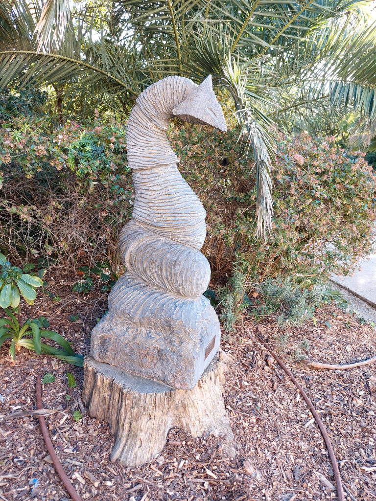 Escultura en pedra de color gris que interpreta de manera abstracta la figura d’un drac. Tallada en un sol bloc de pedra, la base quadrangular contrasta amb la resta de l’escultura, de formes sinuoses i rugoses que recorden el cos d’una serp que s’enrosca sobre si mateixa en un intent de posar-se dreta. A l’extrem superior es presenta el cap, de manera esquemàtica, amb una forma triangular.