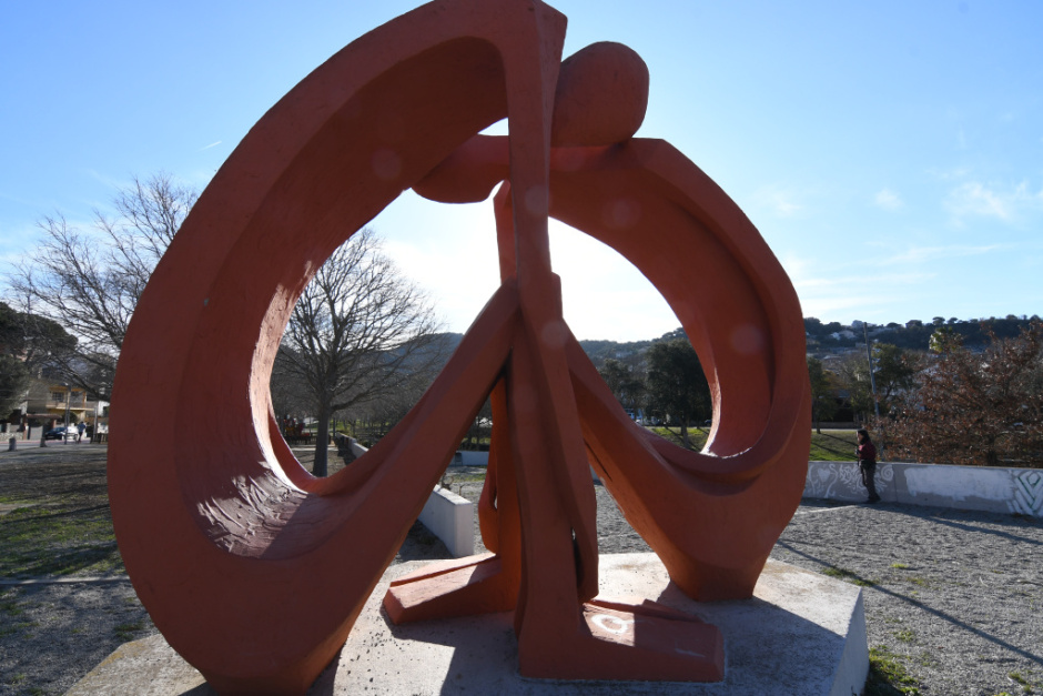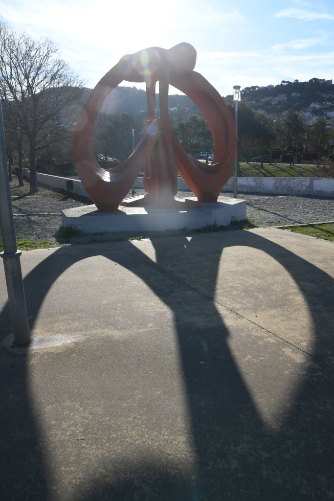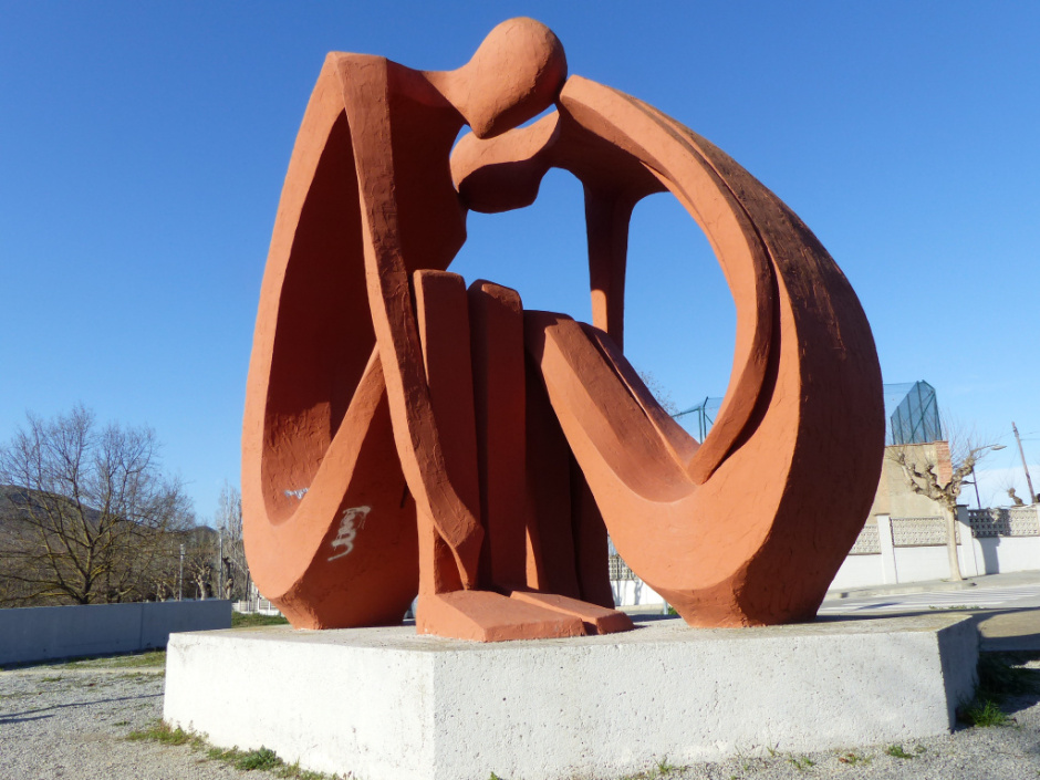 Escultura de gran format, de 4 m d'alçada, que consta de dues figures antropomorfes, però estilitzades, que estan assegudes, amb les cames plegades i que es recolzen el cap en l'espatlla de l'altre. Els braços caiguts en paral·lel a les cames.