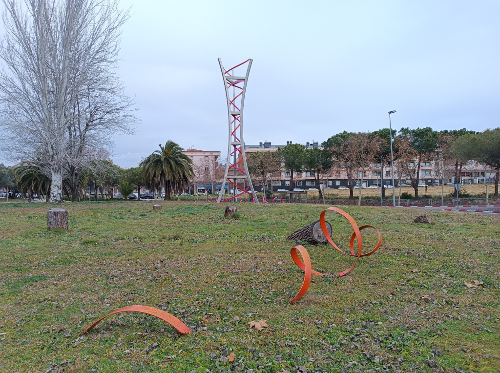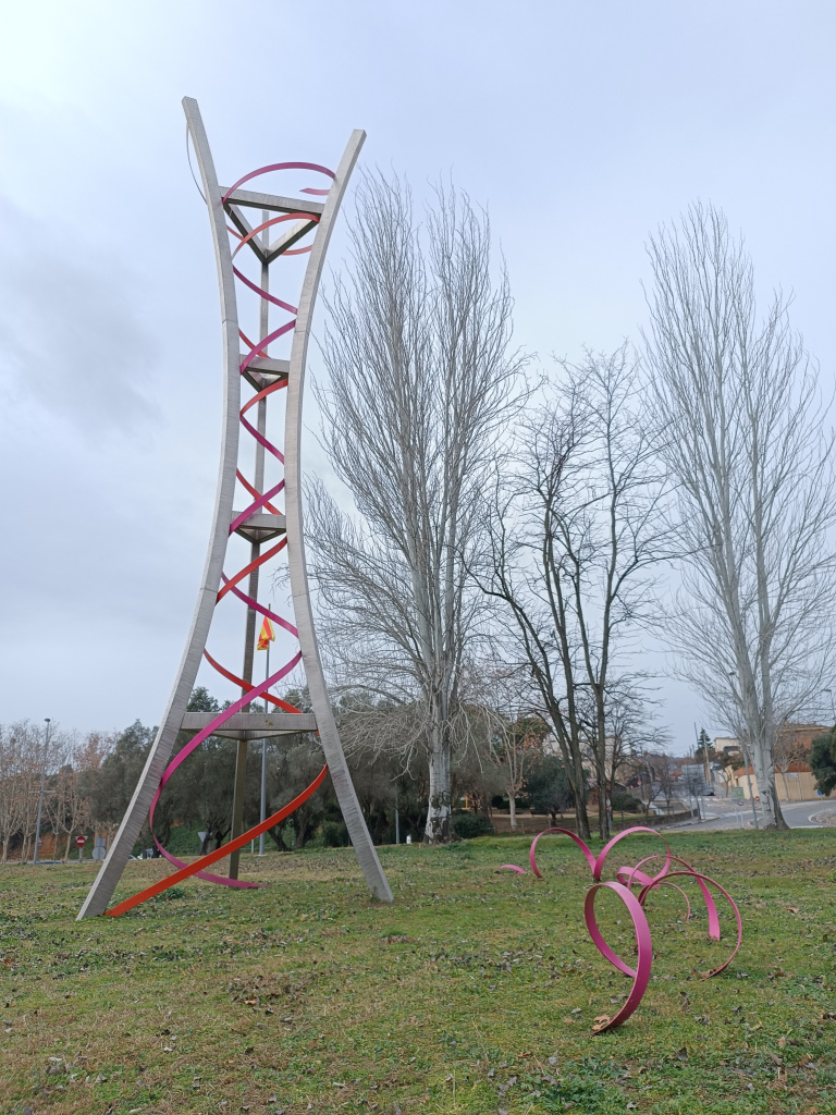 “Continuum” és una escultura formada per un element principal, situat a la plaça de l’Estació, i diversos elements secundaris distribuïts al Parc de les Morisques. L’element central consisteix en una gran estructura vertical d’acer inoxidable de 14 metres d’alçada formada per tres eixos verticals, lleugerament corbats cap enfora, i quatre eixos travessers que les uneixen formant una torre. Dues línies d’acer, pintades de vermells diferents, s’entortolliguen entre elles formant una espiral que davalla per l’estructura i s’enfonsa al terra. Després, les dues línies va apareixent i desapareixent per separat al seu voltant i en d’altres indrets més allunyats del poble.