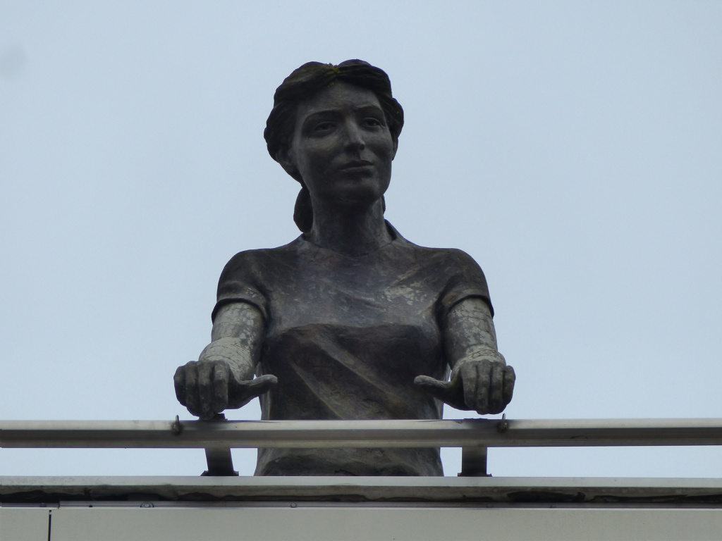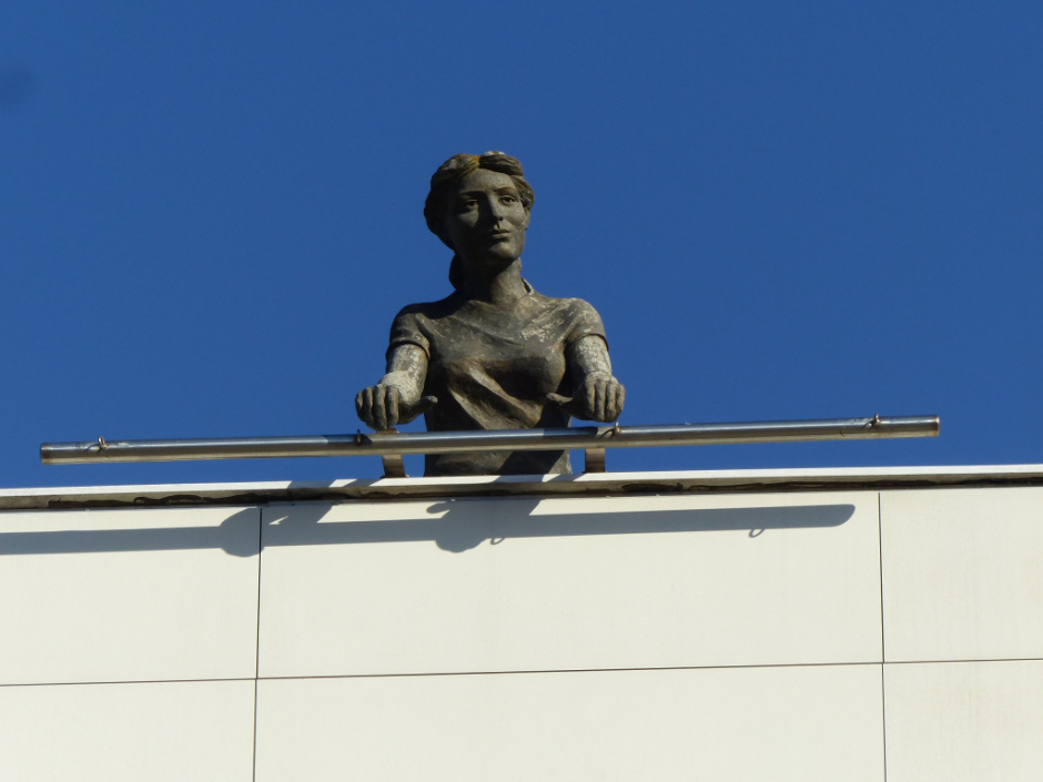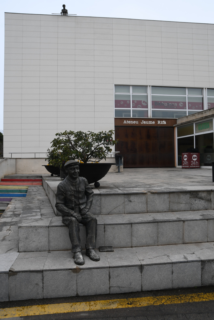 Escultura d'una dona recolzada en una barana posada al terrat de l'edifici de l'Ateneu i mirant a la plaça. Quan l'alcalde de Sant Fost de Campsentelles visita el poble Cubà de Cueto, va veure que era freqüent penjar una pancarta en una barra fixada pels extrems a una figura.