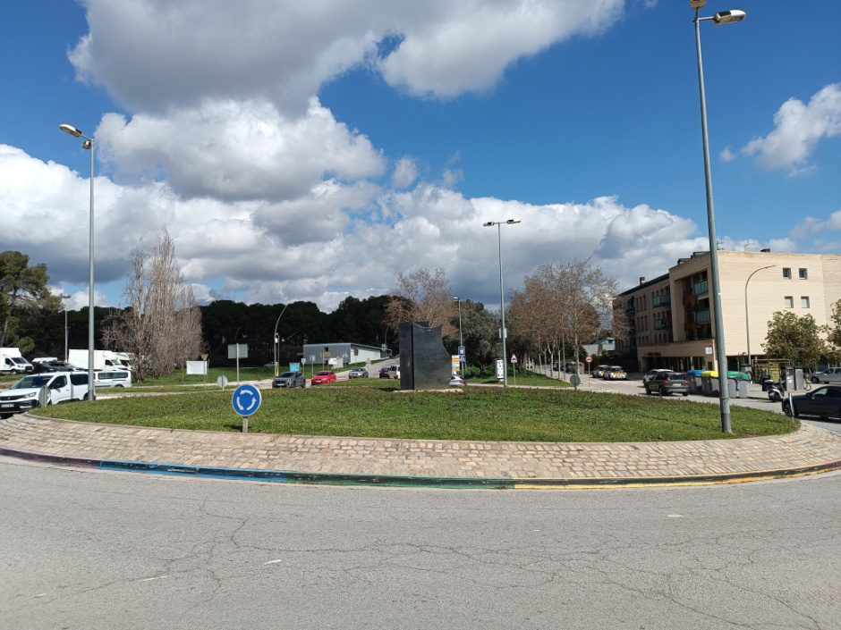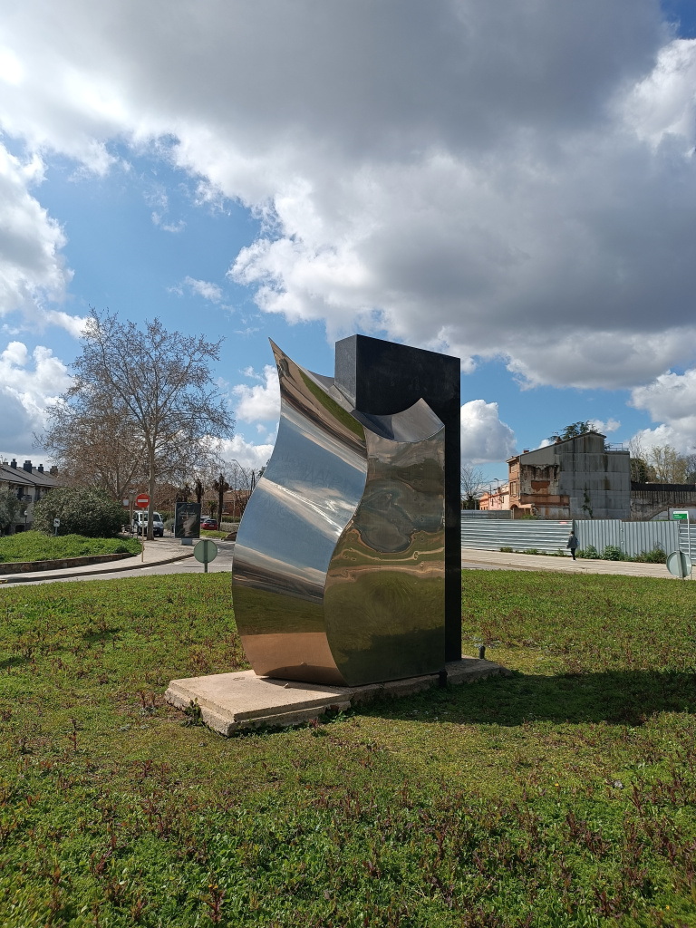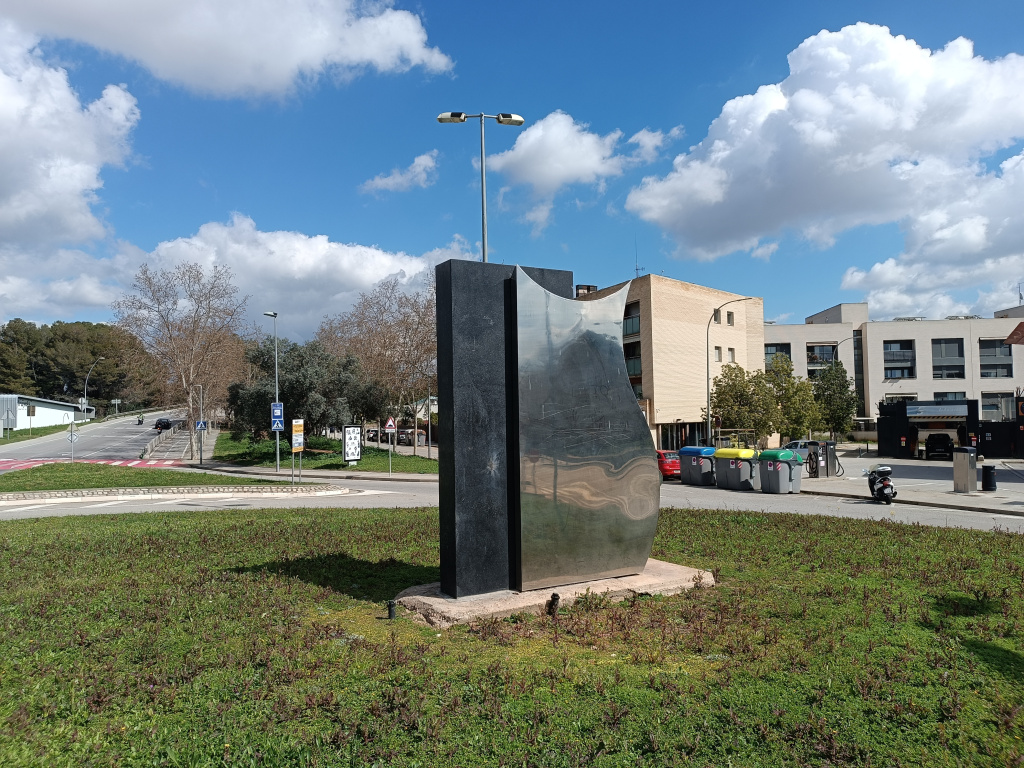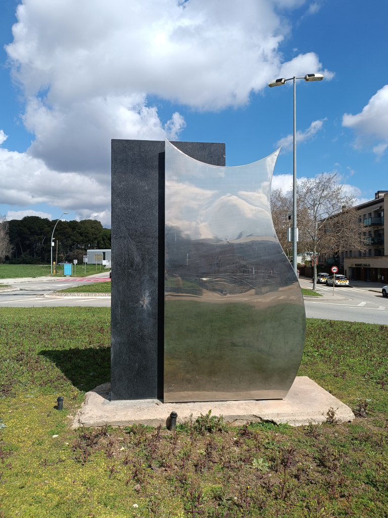 Escultura formada per un monòlit rectangular de granit negre, de tres metres d’alçada, i una figura sinuosa d’acer inoxidable que l’abraça per un lateral. Aquesta figura representa, de manera molt esquemàtica, un duc o mussol, recognoscible pel cos arrodonit i sobretot per l’acabament de la part superior en dues puntes que simulen les orelles. L’escultura s’aixeca damunt una base rectangular de formigó de 2x1’50 metres, situada al centre d’una de les rotondes d’accés a Sant Quirze.