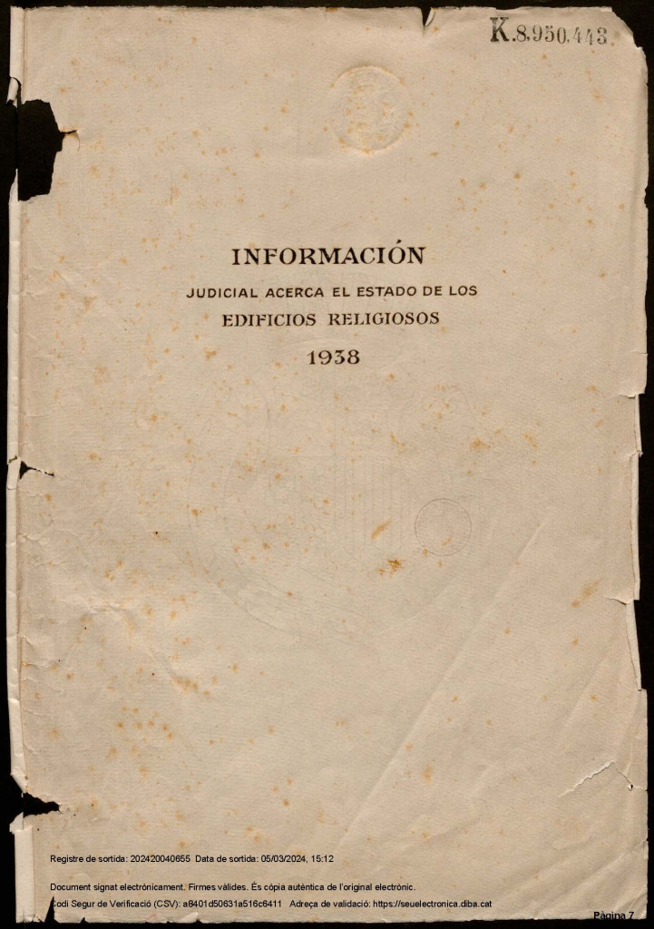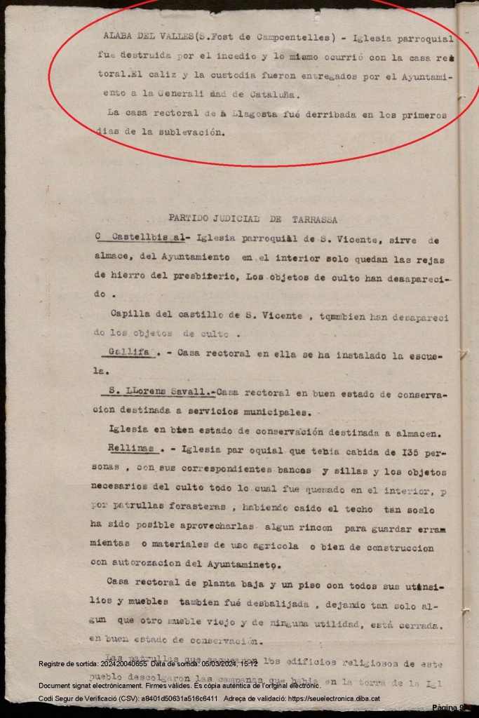 Es conserva la informació judicial sobre l’estat dels edificis religiosos (fitxer 101_spal_001_1938) : K.8.950.442. “INVENTARIO de los EDIFICIOS DE CARACTER RELIGIOGO del territorio de la Audiencia de Barcelona con expresión del destino que tenían a princios de 1938”. ALABA DEL VALLES (S. Fost de Campcentelles) – Iglesia parroquial fue destruïda por el incendio y lo mismo ocurrió con la casa rectoral. El caliz y la custodia fueron entregados por el Ayuntamiento a la Generalidad de Cataluña”.