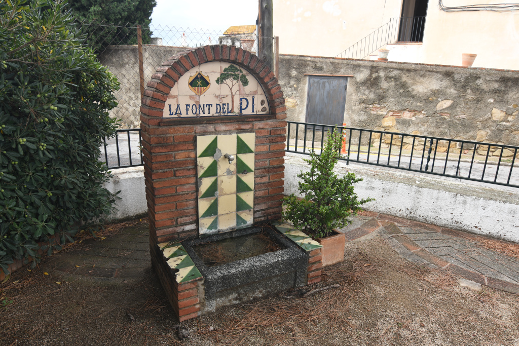 La Font del Pi es troba a la plaça del Tussol, ubicada al carrer de Dalt, al costat de ca n'Icu. Forma part d'un conjunt de fonts urbanes construïdes a la mateixa època i que totes porten el nom d'un arbre. Un mateix disseny amb unes rajoles personalitzades en el frontó serveix com a punt de partida per a totes elles. Consisteix en un frontis fet de maons amb un acabament de mig punt amb els maons posats a llibret. En el timpà hi ha un plafó ceràmic on hi ha l'escut municipal, en un costat, el nom de la font a sota, i un pi. Tot resseguint els contorns amb una franja verda amb dues pinyes al costat inferior dret, com element ornamental. No es llegeix la signatura de l'autor del plafó. Sota el timpà un altre plafó rectangular amb tres franges: les dues laterals fetes amb la rajola de la vela i la franja central de rajoles llises, serveix per emmarcar el broc, que és modern de polsador. L'aigua va a parar a una pica rectangular, feta de pedra i delimitada als costats per un aixecament de maons coronats per rajoles de la vela.