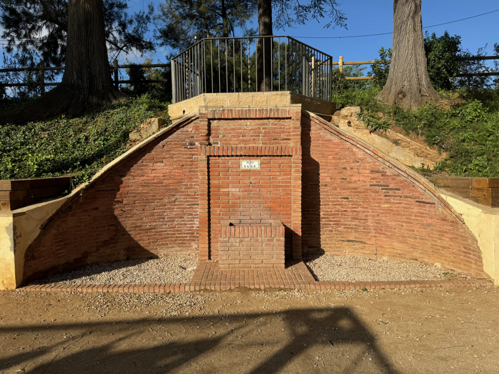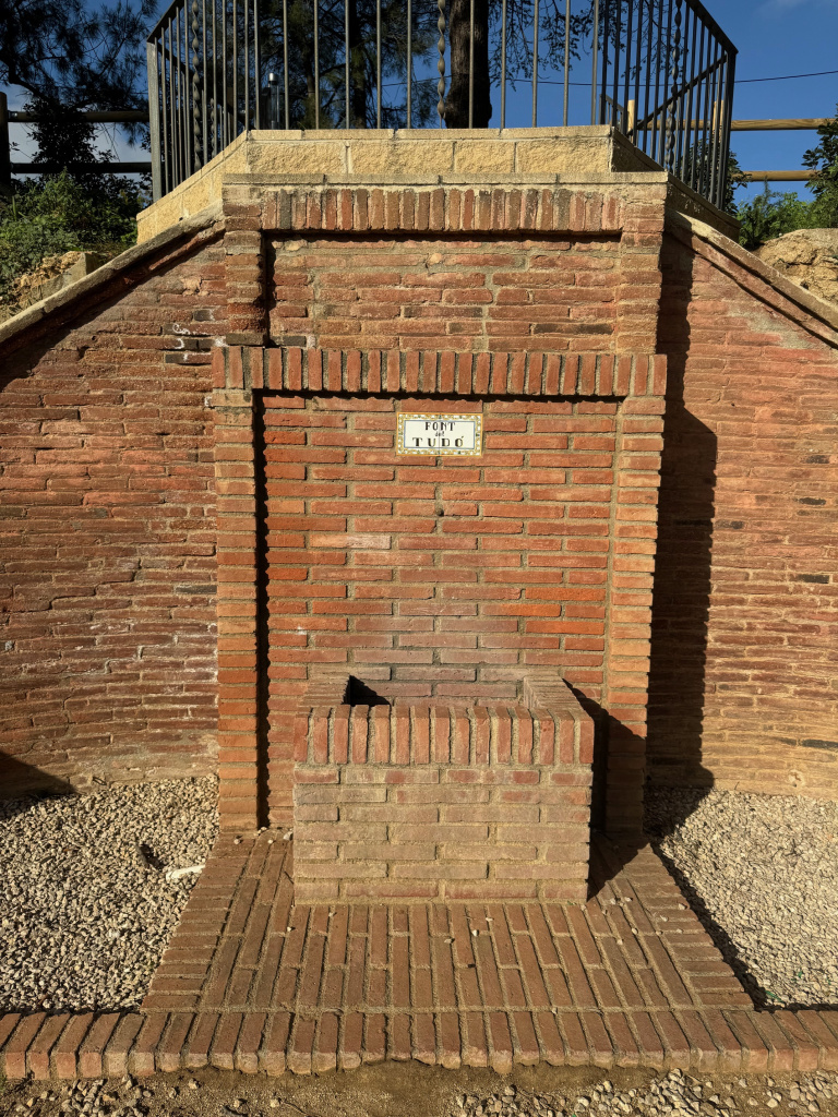 La Font del Tudó es troba dins el Parc dels Germans Gabrielistes, juntament amb la Font de les Moreres i la Font de l'Eucaliptus. Forma part d'un conjunt de fonts urbanes construïdes a la mateixa època i que porten, majoritàriament, el nom d'un arbre. En aquest cas, porta el nom d'un ocell de la família dels colúmbids. Tota ella està feta de maons vistos amb un frontis recte, a diferència de les altres fonts del mateix tipus que tenen el frontis de punt rodó o d'arc apuntat. Aquest frontis té un emmarcament que, a la part superior, disposa dels maons a plec de llibre. Sota aquest emmarcament i centrat, hi ha un plafó ceràmic amb el nom de la font. Tot resseguint els contorns hi trobem una sanefa com element ornamental. No hi ha broc. La pica, també feta de maons vistos, és de planta rectangular, feta també de maons. Tot plegat, emmarcat per un mur de contenció pel desnivell del terreny fet de maons, com la font.