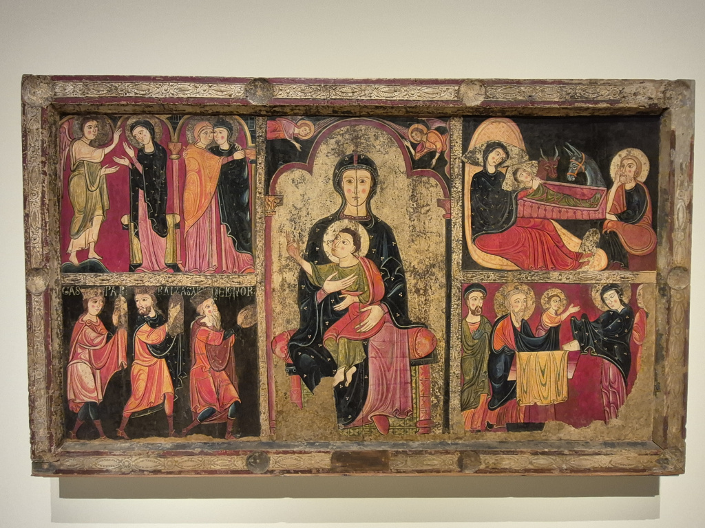 Frontal d'altar realitzat sobre fusta d'àlber al tremp d'ou amb presència de tècniques de colradura i estucat. Medeix 105x176 cm. La pintura està distribuïda en cinc compartiments: un central i dos a cada costat. Al central hi ha la imatge de la Mare de Déu sedent amb el fill als braços i flanquejada per dos àngels als angles superiors. A cada costat hi ha dos compartiments que presenten diverses escenes relacionades amb el cicle de la infantesa de Jesús en els quals intervingué la Verge: l'Anunciació i la Visitació (compartiment superior esquerre), Naixement (compartiment superior dret), l'Epifania (inferior esquerre) i la Presentació al temple (inferior dret). Els compartiments estan envoltats per una motllura en relleu a modus de marc. Es van utilitzar principalment els colors blaus, vermells, taronges, groc i verd, i les figures estan perfilades per una línia negra.