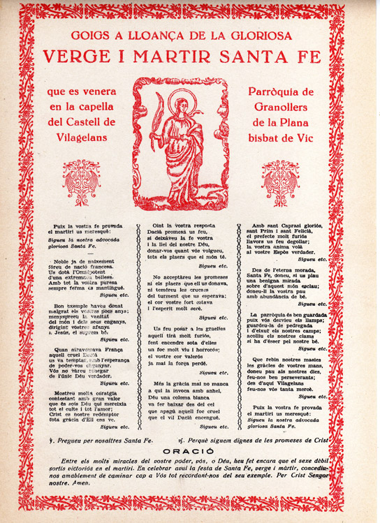 Es tracta dels Goigs en honor a Sant Fe, verge i màrtir, que es venera a la capella del Castell de Vilagelans de la parròquia de Sant Esteve de Granollers. Els Goigs estan emmarcats en un requadre que presenta motius geomètrics. A la part superior hi ha un dibuix de Santa Fe amb la palma del martiri, flanquejat per motius geomètrics. A la part central hi ha les estrofes de la vida de la santa i de lloança i pregàries dels vilatans que s'encomanen a la seva protecció; a la part inferior hi ha una oració. "Puig la vostra fe provocada el martiri us meresqué: Sigueu la nostra advocada gloriosa Santa Fe. Noble ja de naixement fóreu de nació francesa Us dotà l'Omnipotent d'una extremada bellesa. Amb tot la vostra puresa sempre ferma es mantingué. Sigueu etc. Bon exemple haveu donat malgrat els vostres pocs anys; menyspreeu la vanitat del món o dels seus enganys, dirigint vostres afanys a Jesús, el suprem bé, Sigueu etc. Quan atravessava França aquell cruel Dacià us va temptar, amb l'esperança de poder-vos enganyar. Vós no vàreu renegar de l'únic Déu verdader. Sigueu etc. Mostreu molta coratgia contestant amb gran valor que és sols Déu qui mereixia tot el culte i tot l'amor; Crist és nostre redemptor tota gràcia d'Ell ens ve. Sigueu etc. Oint la vostra resposta Dacià promesa us feu, si deixàveu la fe vostra i la llei del nostre Déu, donar-vos quant vós volgueu tots els plaers que el món té. Sigueu etc. No acceptàreu les promeses ni els plaers que ell us donava, ni teméreu les crueses del turment que us esperava; el cor vostre fort estava i l'esperit molt serè Sigueu etc. Us feu posar a les graelles aquell tirà molt furiós, fent encendre sota d'elles un foc motl viu i horrorós, el vostre cor valerós ja mai la força perdé. Sigueu etc. Més la gràcia mai no manca a qui la invoca amb anhel, Déu una coloma blanca va fer baixar des del cel que apagà aquell foc cruel que el vil Dacià encengué Sigueu etc. Amb sant Cristòfol gloriós, sant Prim i sant Felicià, el prefecte molt furiós llavors us feu degollar; la vostra ànima volà al vostre Espòs verdader Sigueu etc. Des de l'eterna morada, Santa Fe, doneu, si us plau una benigna mirada sobre d'aquest món esclau; doneu-li la vostra pau amb abundància de bé. Sigueu etc. La parròquia és ben guardada puix vós desvieu els llamps; guardeu-la de la pedregada i d'eixut els nostres camps; acolliu els nostres clams si ha d'ésser pel nostre bé. Sigueu etc. Que rebin nostres masies les gràcies de vostres mans, doneu pas als nostres dies, feu-nos ben perseverants; des d'aquí Vilagelans feu-nos vós tanta mercè. Sigueu etc. Puig la vostra fe provocada El martiri us meresqué: Sigueu la nostra advocada Gloriosa Santa Fe"