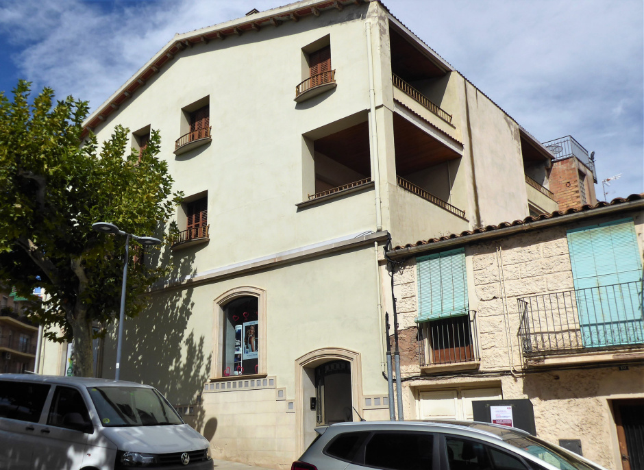 Casa parcialment entre mitgeres emplaçada al nucli urbà de Balsareny. L’edifici destaca per una certa voluntat de donar rellevància a la seva posició preeminent, fent cantonada entre la carretera de Berga i la Baixada del Torrent. És un edifici de planta quadrada i consta de planta baixa més dos pisos. La façana principal, que dona a la carretera, es caracteritza per una composició ben ordenada en base a tres eixos d’obertures. Al nivell inferior hi ha el portal, a la dreta, acompanyat de dos amplis finestrals que serveixen d’aparador a l’establiment. Totes tres obertures són perfilades amb motllures de pedra i rematades amb arcs escarsers. Al primer pis s’estén un ampli balcó corregut amb barana de ferro forjat, mentre que al segon pis les obertures són en forma de finestres balconeres, baixes i amples, amb la particularitat que tenen uns ampits arrodonits. Les obertures dels pisos superiors són tancades amb persianes de llibret i, les que estan situades al centre, tenen una major amplada.