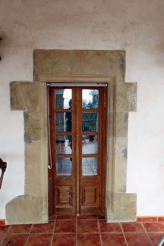 Llinda de pedra que forma part d'una porta situada a la masia de l'Enric de la Serra, concretament a la façana sud que dóna a una galeria. És de forma rectangular i, a la part inferio, té unes motllures que emmarquen la porta. La llinda conté un interessant gravat amb els següents elements: la data 1615, l'acrònim "IHS" amb una creu i, just al damunt, un curiós gravat amb les figures del Sol i la Lluna. Molt probablement aquesta era la porta per on s'accedia a l'oratori de la masia, del qual no n'ha quedat cap vestigi.