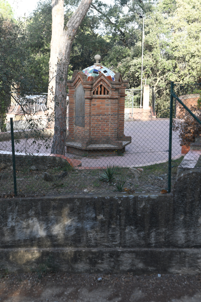 Tot el sòcol, d'alçada considerable, és fet de paredat antic, emmarcat i resseguit per una franja pintada de vermell. Damunt d'una de les portes d'entrada hi ha l'au Fènix, símbol de la Renaixença amb l'escut de Catalunya al centre.