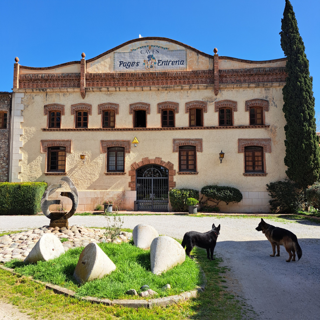 Està format per quatre volums, dos dels quals adossats al principal i un altre d'aïllat. El volum principal consta de planta semisoterrani, planta baixa i pis i té la coberta a dos vessants amb el carener paral·lel a la façana. S'orienta a ponent i té una composició de la façana simètrica. El portal està centrat i és d'arc escarser ceràmic. A cada costat té un finestral d'arc rebaixat ceràmic, amb una motllura superior a mode de guardapols. El pis s'obre amb vuit finestres de la mateixa tipologia però de menors dimensions, que arrenquen d'una imbricació ceràmica. El coronament està definit per una imbricació ceràmica d'on arrenca un capcer sinuós amb pilars d'obra vista amb pinyes decoratives. A la part central del capcer hi ha un plafó de ceràmica on hi diu "CAVES PAGÈS ENTRENA".