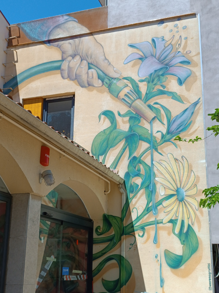 A la part exterior, sobre un fons de color crema, es representa la mà d’una dona gran que rega tres flors amb una mànega. L’artista ha hagut d’adaptar-se a l’arquitectura de la façana, acomodant el dibuix a diversos elements presents al mur com el muntant d’aigua, la motllura de la part superior o el cos que sobresurt. Les tiges afloren des de l’interior de l'edifici on, damunt d’un fons de color vermell, observem com arrelen en un terra d’on surten diversos rotlles de pel·lícula.