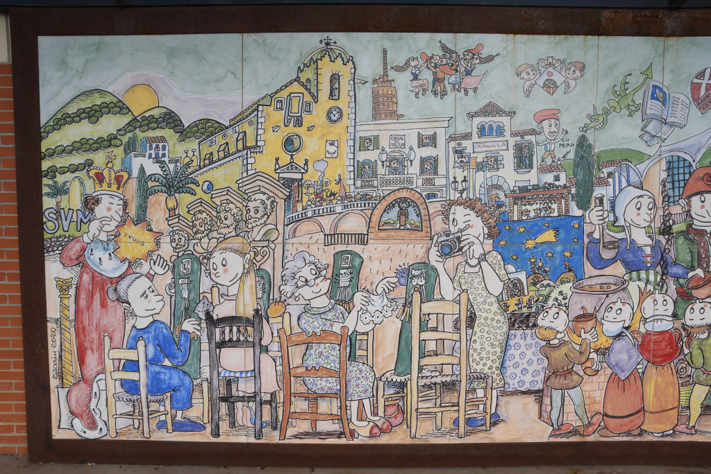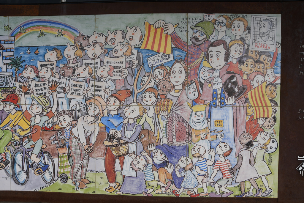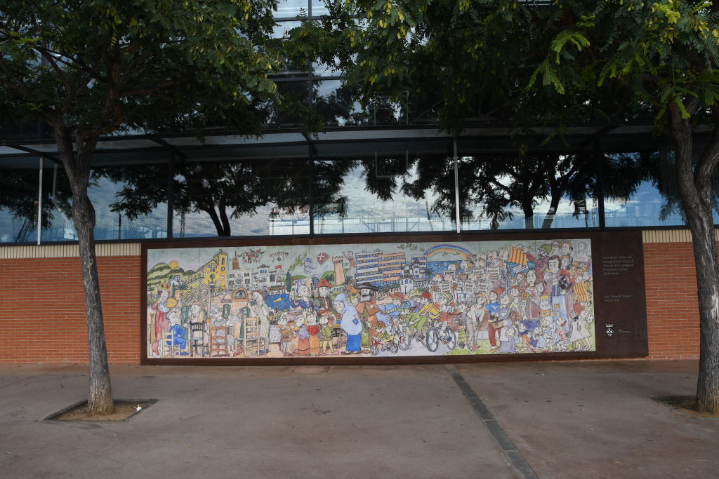 Mural artístic, fet de gres porcellànic, amb il·lustracions de Pilarin Bayés. És una interpretació artística del municipi de Sant Vicenç de Montalt, que mostra personalitats destacades com l'Esteve Albert, poeta i autor teatral que va donar nom a l'institut; l'Angelina Pelagos, telefonista del poble fins a l'any 1976; la Dominica Guitart, mestra de l'antiga escola de nenes; l'entranyable 'Avi Pera' o el missioner Vicenç Ferrer, estretament vinculat a Sant Vicenç gràcies al Campus Solidari de Futbol d'Anantapur. També hi ha representades expressions culturals i tradicionals com les puntaires, els gegants i els Bòbuls i les Margaridasses, els cantaires de l'Orfeó o els pessebres; i referències a esdeveniments esportius com la Montalbike o el futbol. També hi tenen protagonisme edificis emblemàtics del poble com el Casal de Cultura, l'Església, l'Ajuntament i la torre de guaita del parc dels Germans Gabrielistes; i no hi podien faltar tampoc el mar i el Montalt.