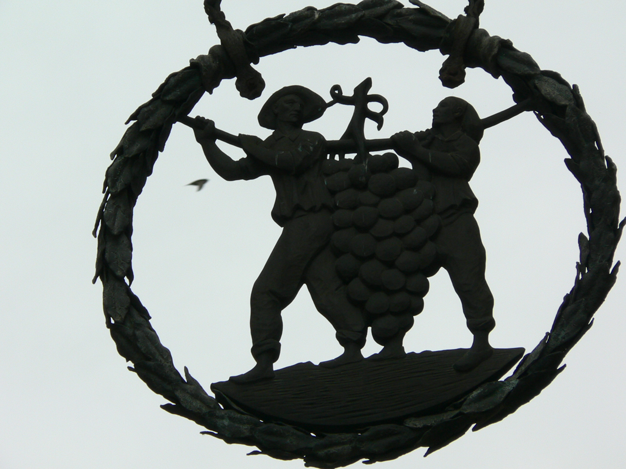 Grua, portaensenya o braç de ferro forjat amb motiu al·legòric al treball de la vinya. El braç o escaire, pròpiament dits, es desenvolupa en formes vegetals ondulants. Es tracta del suport d'un medalló fet a base de fulles, potser de llorer, al mig del qual s'hi representa una escena al·legòrica de la verema: dos camperols porten a les seves espatlles un gran pàmpol de raïm.