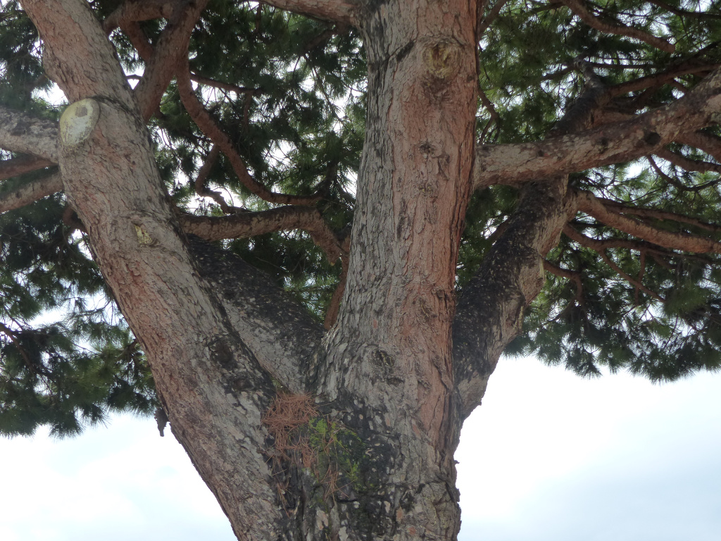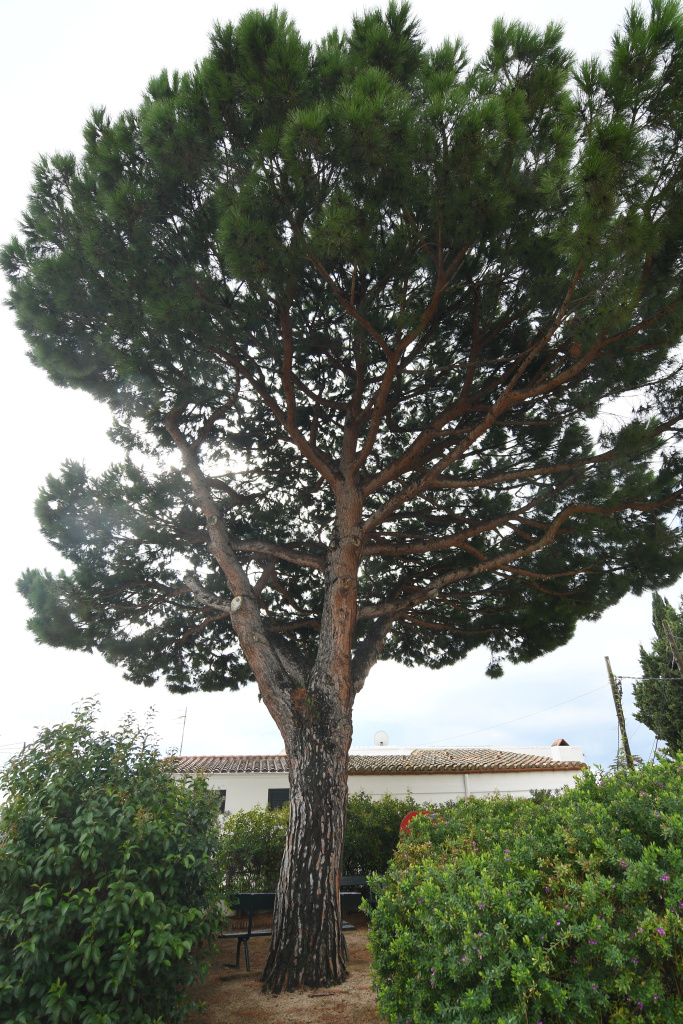 El contorn del tronc, lleugerament inclinat mesura uns 2, m de perímetre per una alçada d’uns dotze metres. La capçada és uniforme en forma d’ombrel·la, gràcies a una brancada potent i robusta que es bifurca donant-li una forma perfectament arrodonida.
