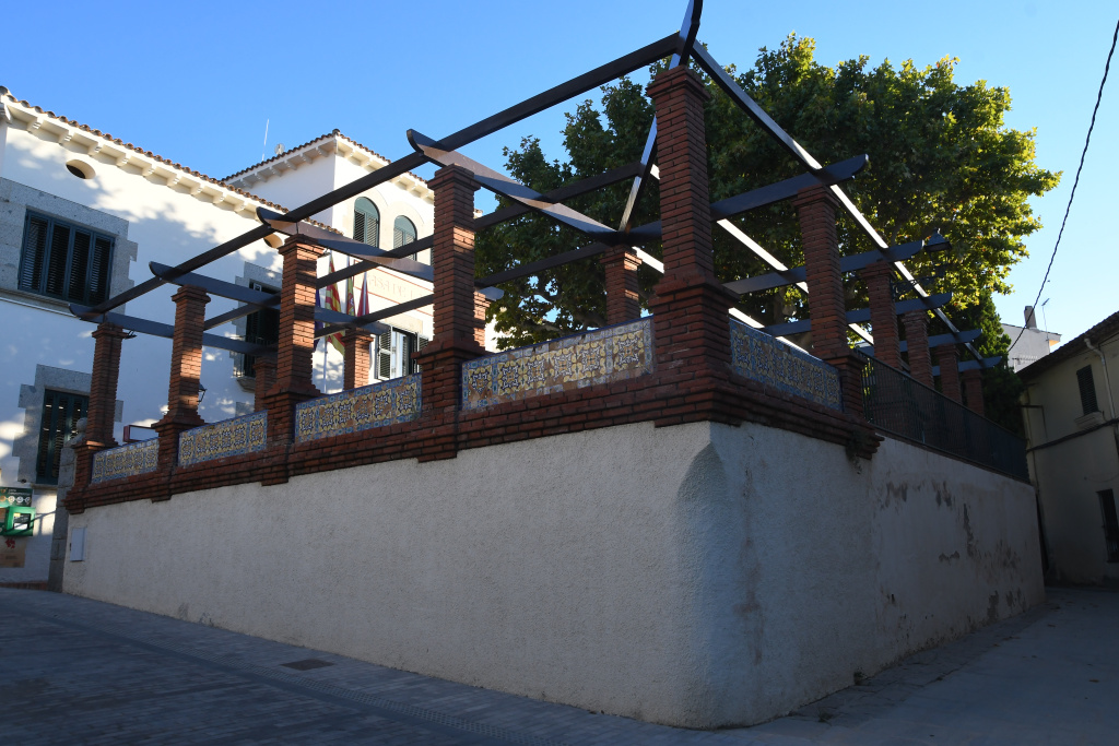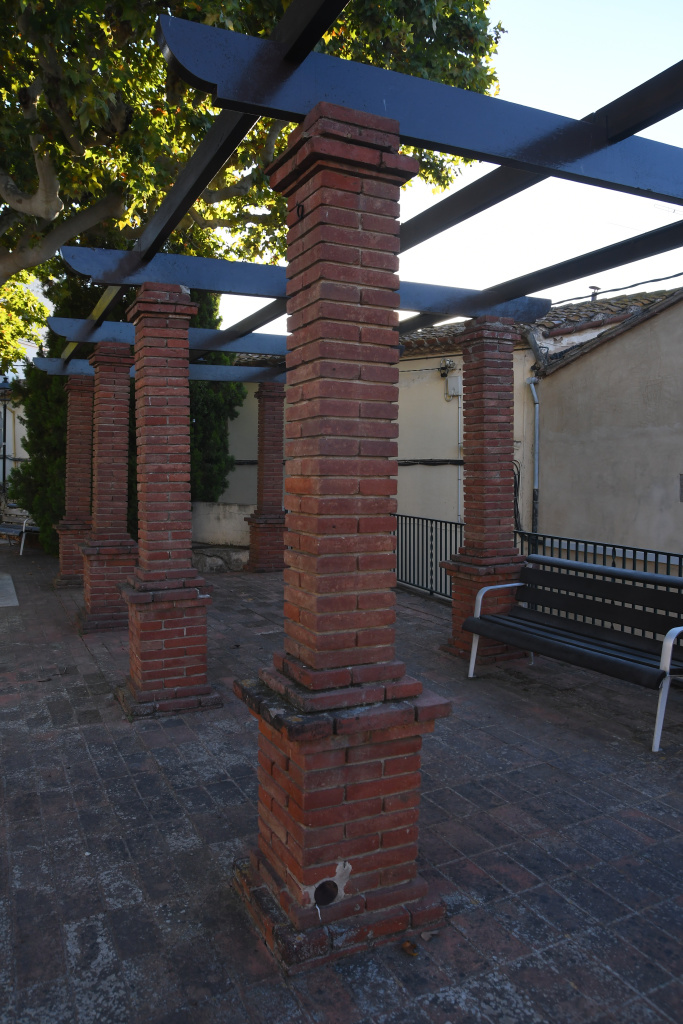 Aquest porxo forma part de l'espai frontal de l'actual Ajuntament, que es complementa amb una petita zona de parterres, amb plataners, una font i una premsa de vi col·locada com un element etnogràfic decoratiu.