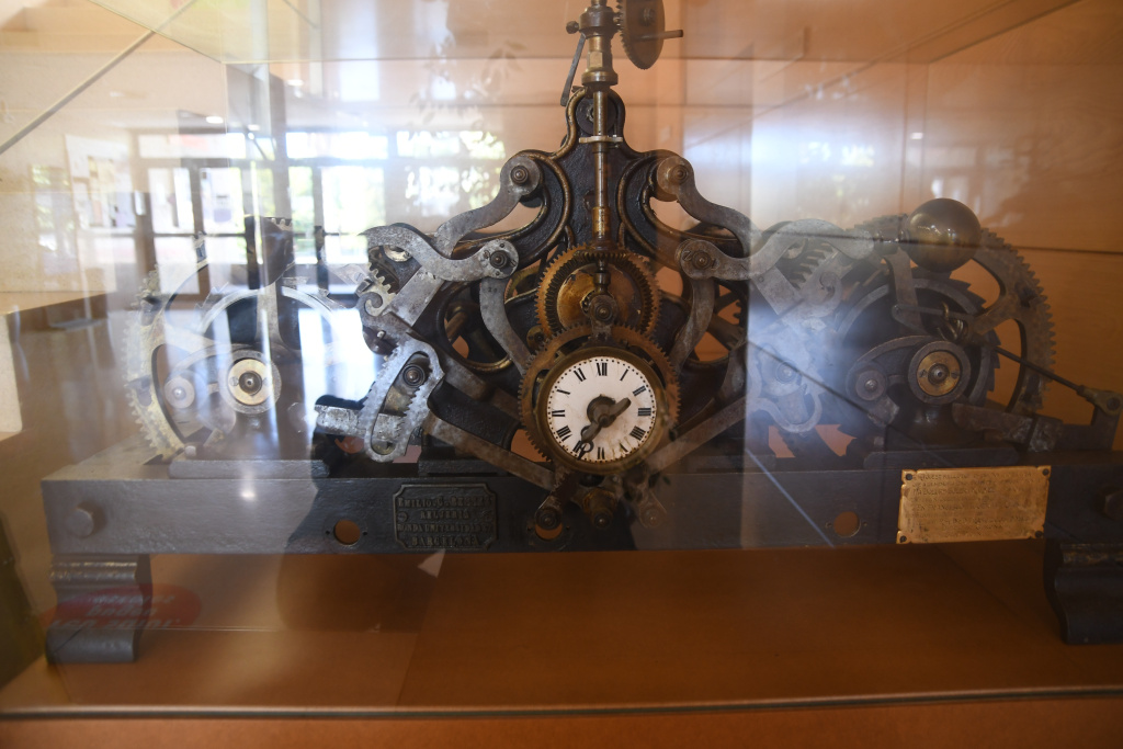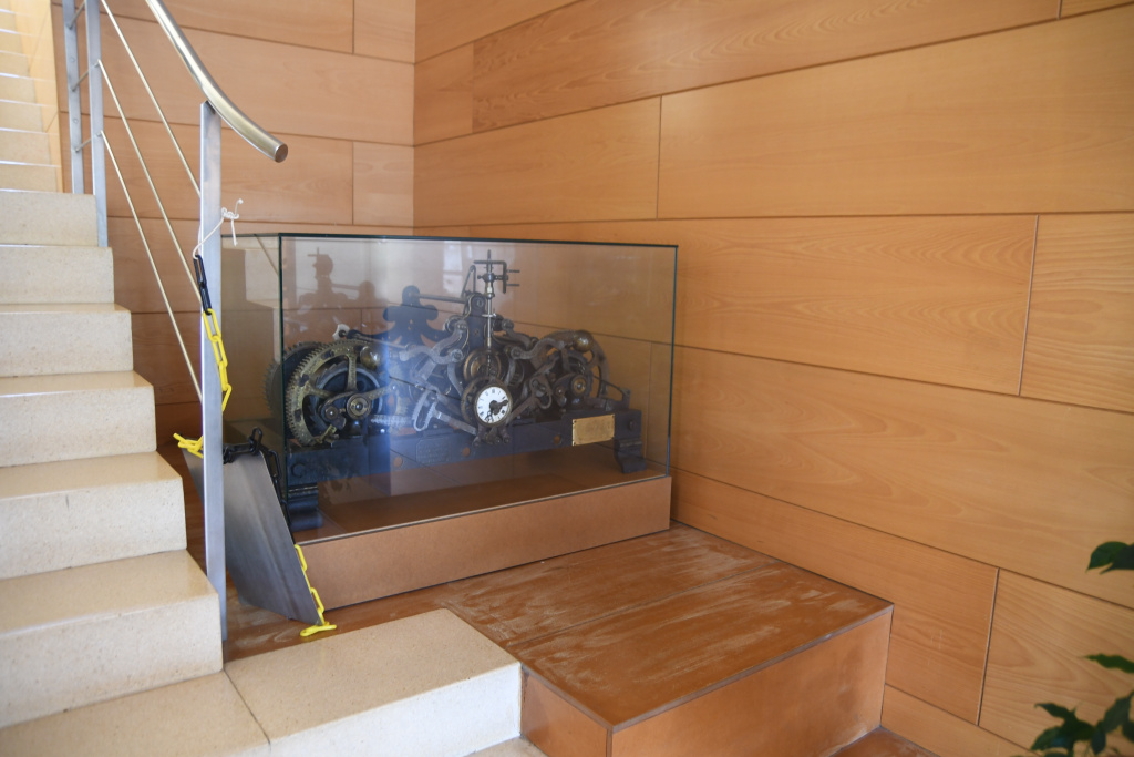 Antic rellotge del campanar de l'església de Sant Vicenç que es preserva al Centre Cívic, a l'interior d'una vitrina campana. Tota la maquinària està muntada damunt d'una bancada o estructura metàl·lica on hi ha una placa amb el nom del constructor i l'adreça: EMILIO. C. BESSES / RELOJERIA / RONDA UNIVERSIDAD, 37 / BARCELONA. Una gran quantitat de les peces i engranatges que formen la maquinària són de llautó, que és un aliatge de coure i zinc, i també n'hi ha d'acer.