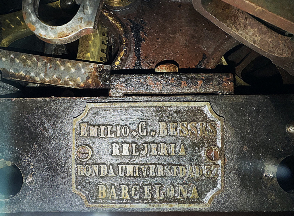 En una altra etiqueta de llautó clavetejada a l'extrem dret, s'hi llegeix la data de col·locació a l'església, la de benedicció i la persona que en fou la promotora: "AQUEST RELLOTGE ES UNA DONACIÓ PIETOSA / QUE A LA MEMORIA I EN SUFRAGI DE SA ESPOSA DIFUNTA / NA DOLORS SOLER I XIVIXELL, AL CEL SIA, / EN PEU A N'AQUESTA IGLESIA PEL SERVEI DEL POBLE. / EN FRANCISCO FIGUERAS I CASALS / FOU COLLOCAT PEL DESEMBRE DE L'ANY 1917 I BENEÏT SOLEMNEMENT / PEL ILM. I RDM. DR. D. FRANCISCO DE P MAS, / BISBE DE GIRONA / EL DIA DE SANT VICENTS DE L'ANY 1918"