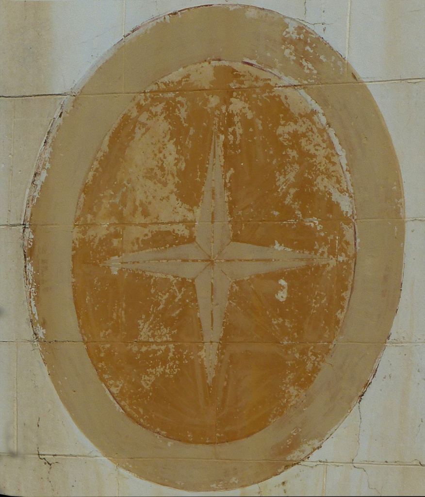A mà esquerra, respectant l’eix de simetria de la façana, hi ha un segon element ornamental que es correspon amb una estrella dels vents parcialment esborrada.