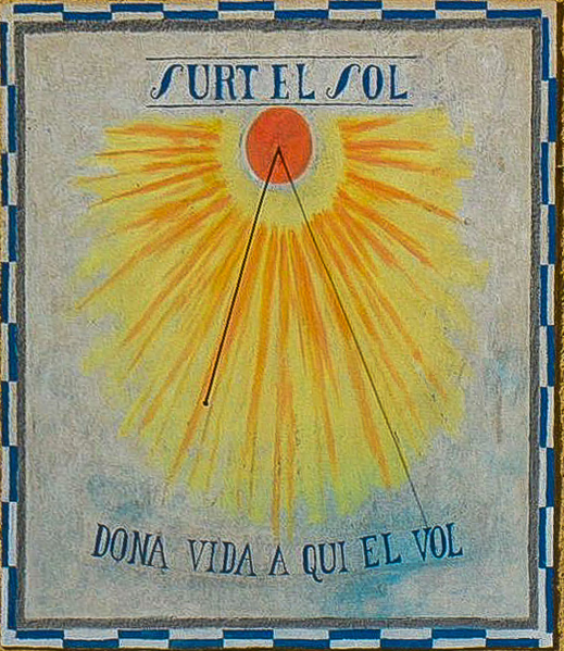 No té números, ni signatura d’autor, però sí un lema. A la part superior, per sobre de l’astre solar i delimitat per dues sanefes lineals, es pot llegir en lletres fetes a plantilla, de color blau, “SURT EL SOL”, mentre que a la part inferior “DONA VIDA A QUI EL VOL”.