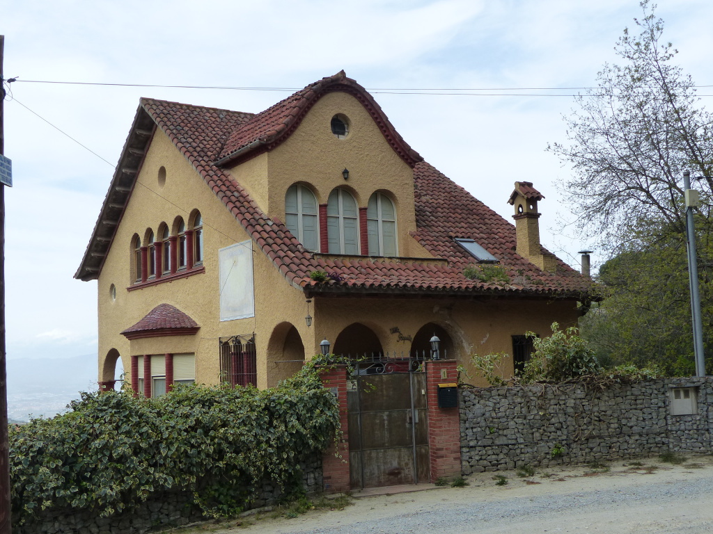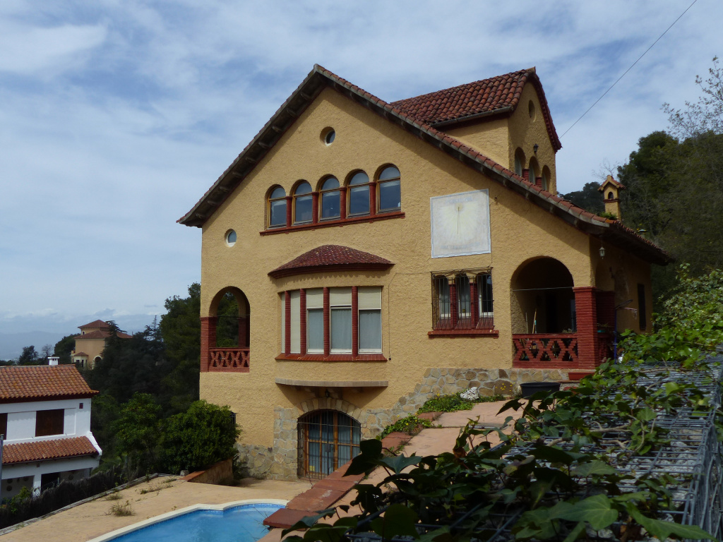 Rellotge de sol del tipus vertical, orientat al sud. Està ubicat a l’extrem dret de la façana principal de la casa, a la planta pis, protegit pel ràfec de la teulada. Presenta una superfície rectangular, realitzada amb morter de calç i lliscada, de fons blavós. Està emmarcat per una línia de color gris pintada directament sobre l’arrebossat de la façana i una sanefa de tancament, realitzada amb morter de calç, on s’hi ha pintat una escala de mesures de color blanc i blau. Està policromat, pintat amb terres.