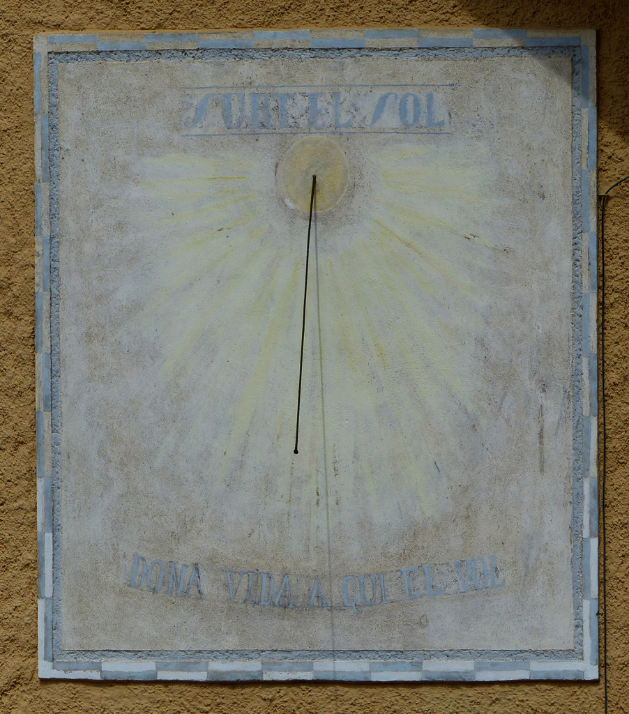 A l’interior, hi ha un disc solar pintat, actualment molt descolorit, però que gràcies a una fotografia de la pàgina de la Societat Catalana de Gnomònica, sabem que el seu color originari és el carbassa, gairebé vermell. Del mig neix el gnòmon de vareta. Tot ell irradia una gran lluminositat, representada per un fons groc amb raigs solars de color carbassa (aquests darrers també desapareguts) pintats al damunt. I tot i que aquests no estan ben definits, sí que semblen assenyalar les hores, destacant el raig més llarg que coincidiria amb l’hora de l’Àngelus (migdia).