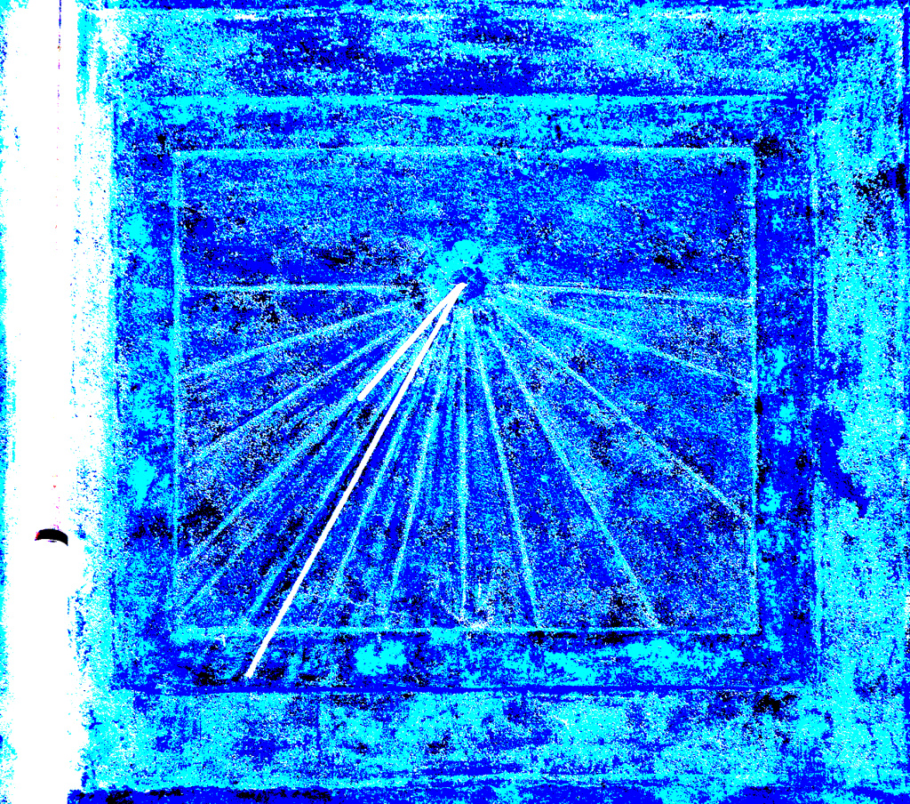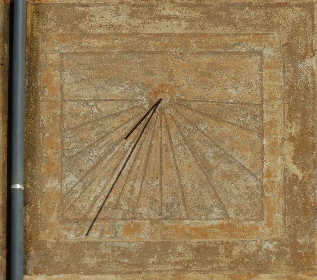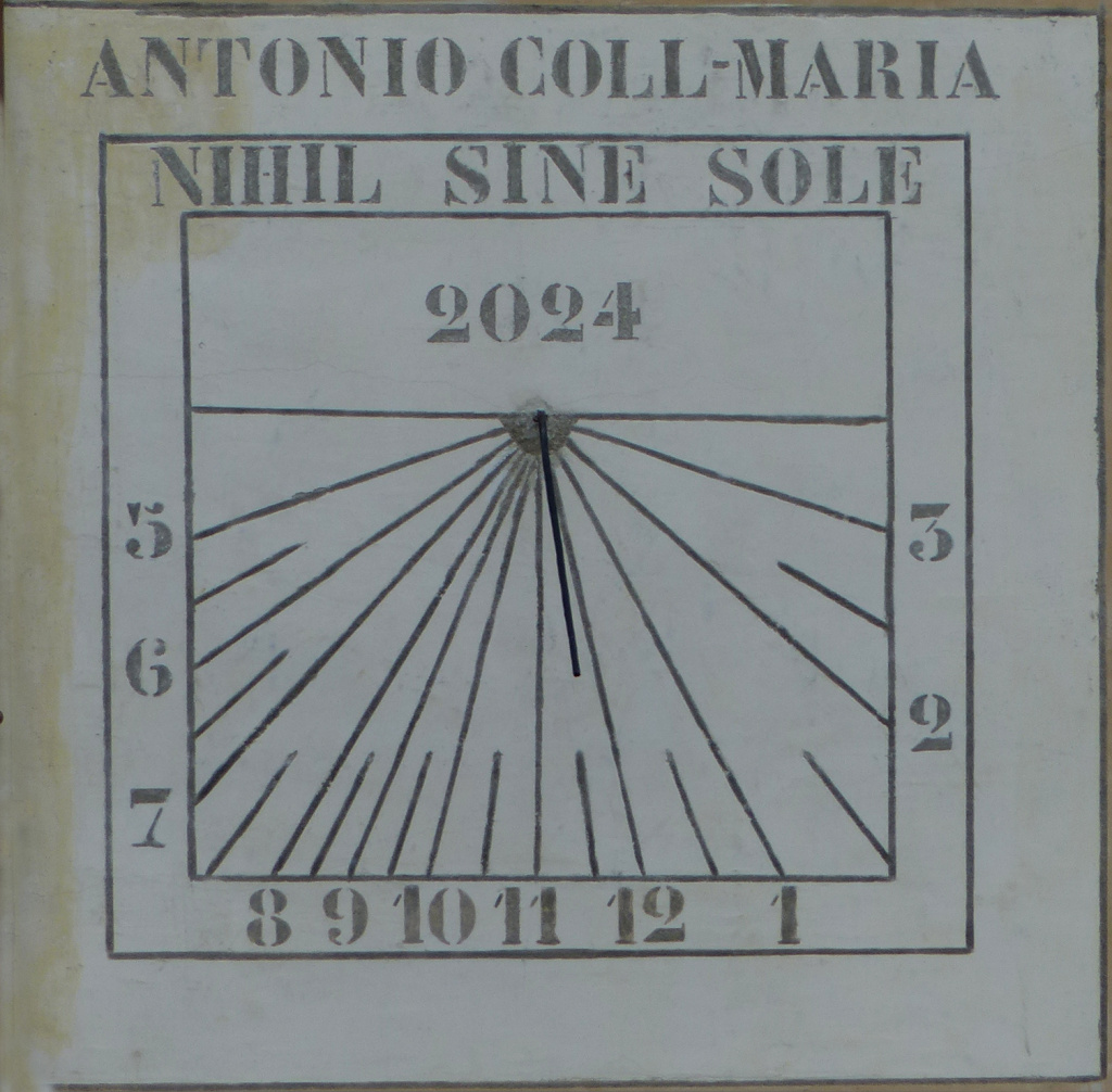 A la part superior del marc interior, en lletres majúscules s'hi llegeix el següent lema "NIHIL SINE SOLE", que vol dir "Res sense el sol". També s'hi han distribuït les hores, que marquen, des de les 5 del matí fins les 3 de la tarda, en xifres àrabs (5,6,7 columna esquerre; 8,9,10,11,12,1 línia inferior; 2,3 columna dreta).