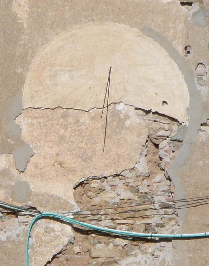 El sol està representat per una rodona centrada a la part superior, una mica difuminada amb el pas del temps, i el gnòmon és de vareta. Només es conserva la meitat superior.