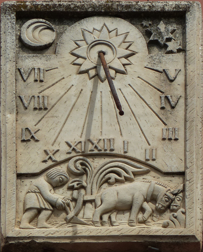 L’ornamentació consisteix en un astre solar amb diverses puntes, al centre del qual neix el gnòmon. A l'extrem superior esquerre, hi ha la lluna, que mostra algunes de les fases lunars, mentre que a la dreta hi ha tres estrelles, de diferents mides. A la part inferior, destaca la figura d’estil medieval d’un llaurador que guia una arada romana tirada per dos rucs.