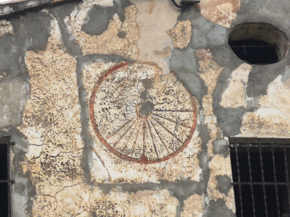 Es tracta d'un rellotge de sol vertical circular i esgrafiat. Ocupa un espai prominent a la façana principal.