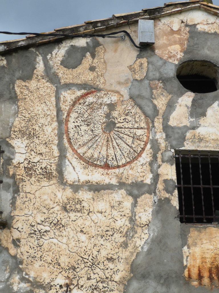 El color emprat per tot el dibuix és el vermell maó sobre el blanc de la façana. Disposa de línies horàries i numeració aràbiga que va des de les vuit del matí fins a les cinc de la tarda, malgrat que els nombres quatre i cinc han desaparegut sota un pedaç de ciment. A la part superior del cercle hi trobem escrit "any 1883" i les inicials "APN".