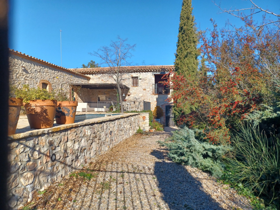 Davant la façana principal hi ha un espai enjardinat tancat per un baluard amb mur de pedra i barana de ferro. El parament dels murs és de pedra irregular rejuntada amb argamassa amb les cantonades de pedra ben escairada i col·locada a mode de cadena cantonera.