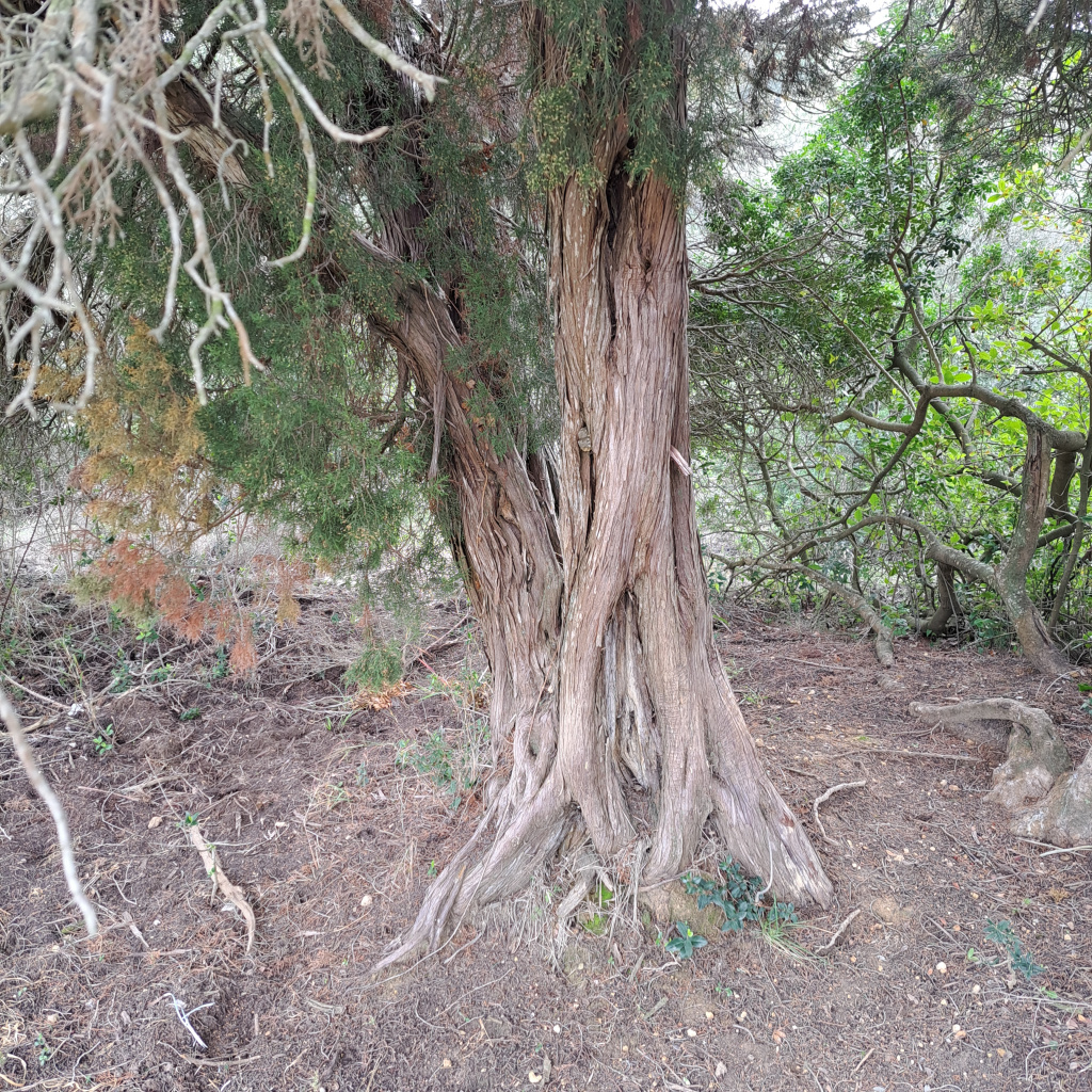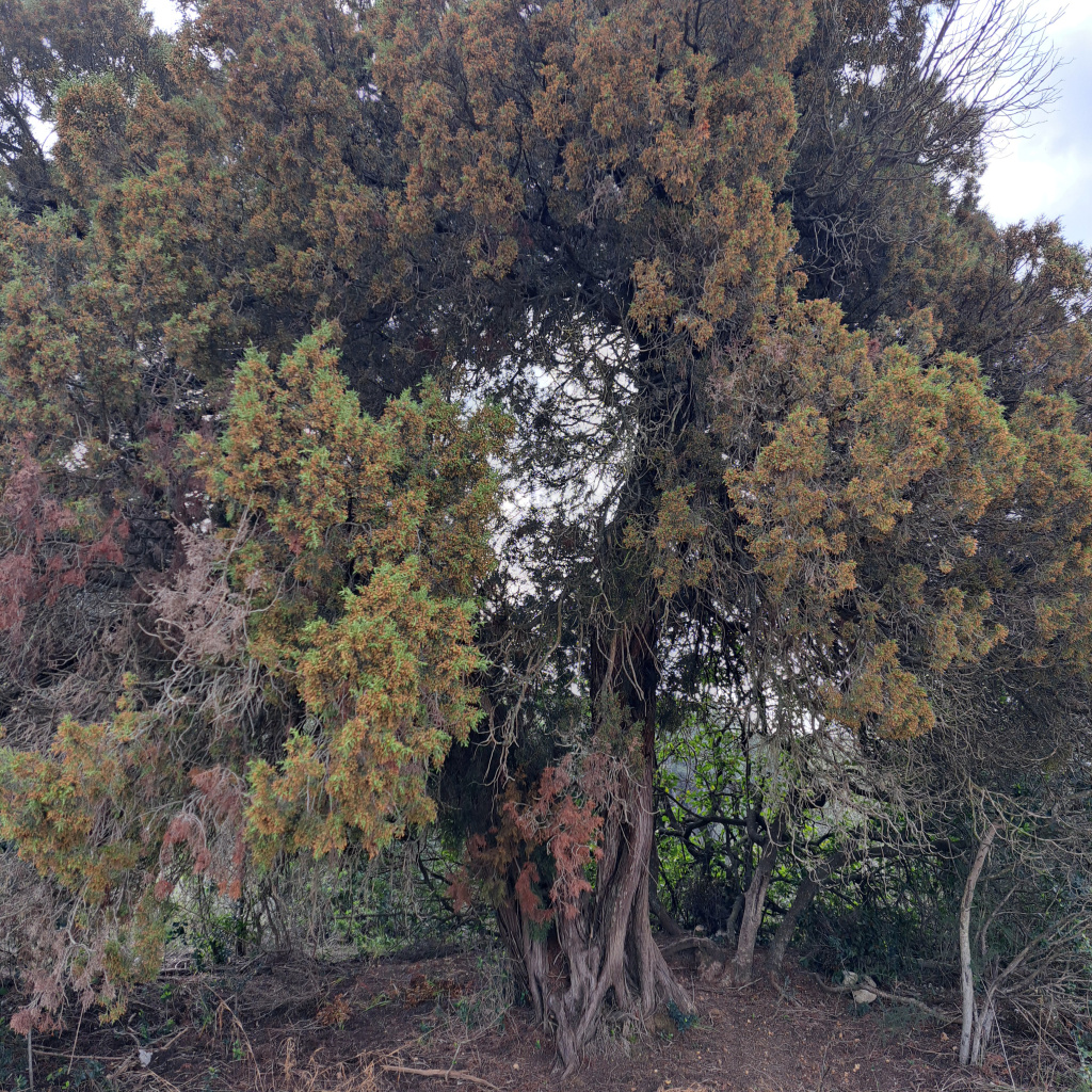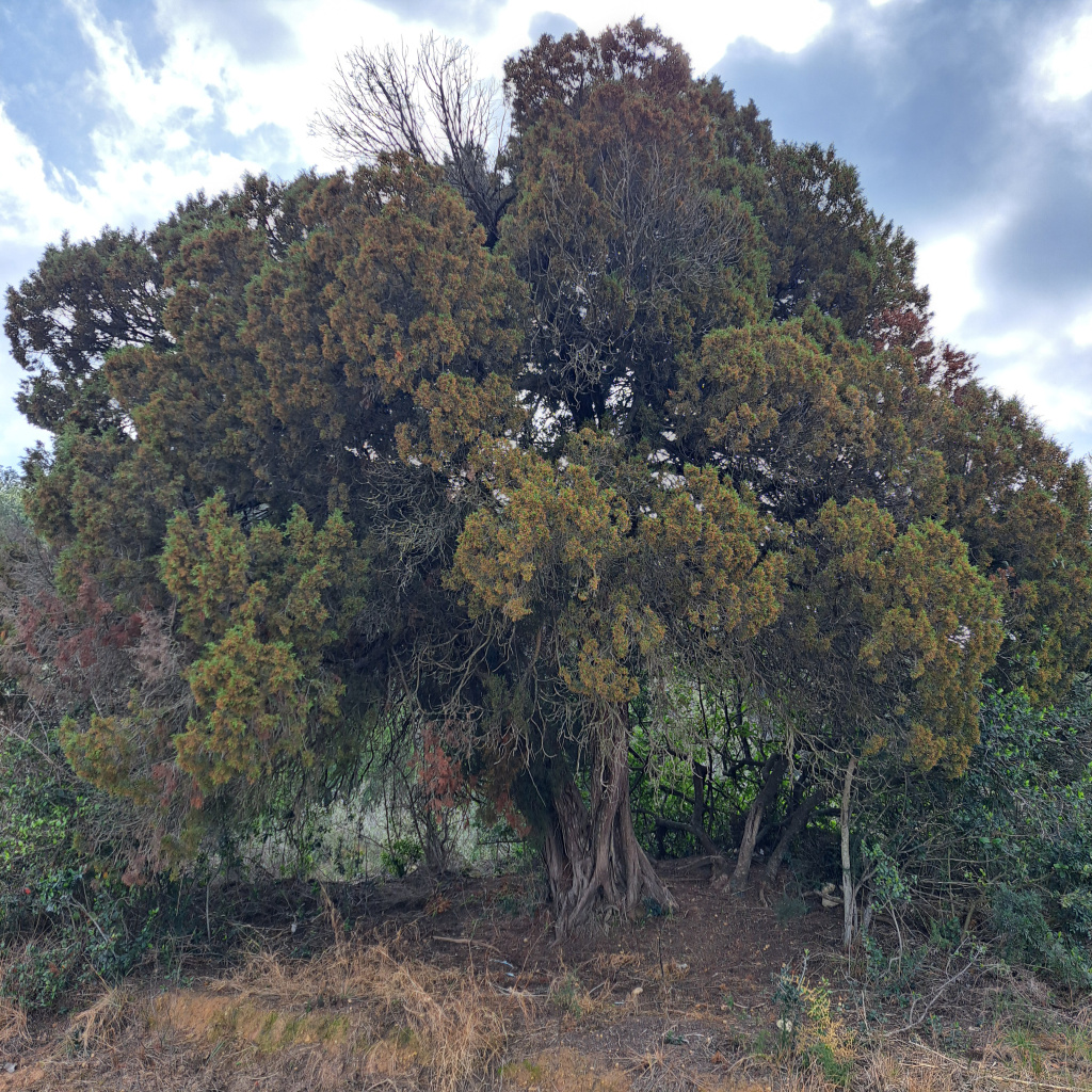 Es tracta d'un exemplar centenari de savina (Juniperus phoenicea), espècie de conífera de la família de les cupressàcies molt comú a l'àrea mediterrània. El tronc és curt i té una capçada arrodonida i molt voluminosa.