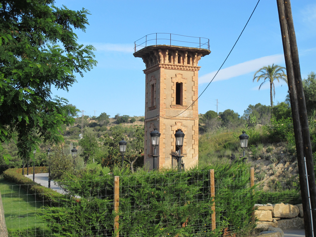 A l'extrem sud del conjunt, un edifici porticat amb arcs rebaixats de maó ceràmic i un templet superior de dues crugies en la part central, que inclou tres arcs de mig punt sobre cada arc inferior, delimita l'estructura. Coberts per a vehicles de construcció recent estan situats a banda i banda del volum principal, i una quadra es troba a l'extrem nord-oest. A l'entrada sud del recinte, es localitza una torre, dipòsit de planta quadrada. També destaca, hereva de l'antic jardí de la torre, l'exemplar de palmera encara viu dels diversos que hi havia al poble.