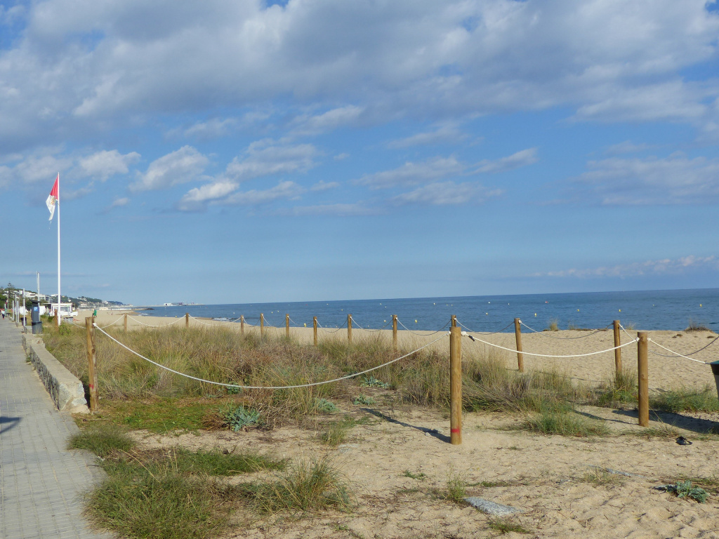 Aquesta franja, prou ampla, té una longitud de 1.300 metres i una amplada mitjana de 80 metres, bàsicament de sorra gruixuda. Queda delimitada, al nord, pel passeig marítim que transcorre paral·lel a la platja per l’anomenat passeig del Marquès Casa Riera, on destaquen un conjunt de cases de la burgesia catalana dels segles XIX i XX, edificades ran de mar.